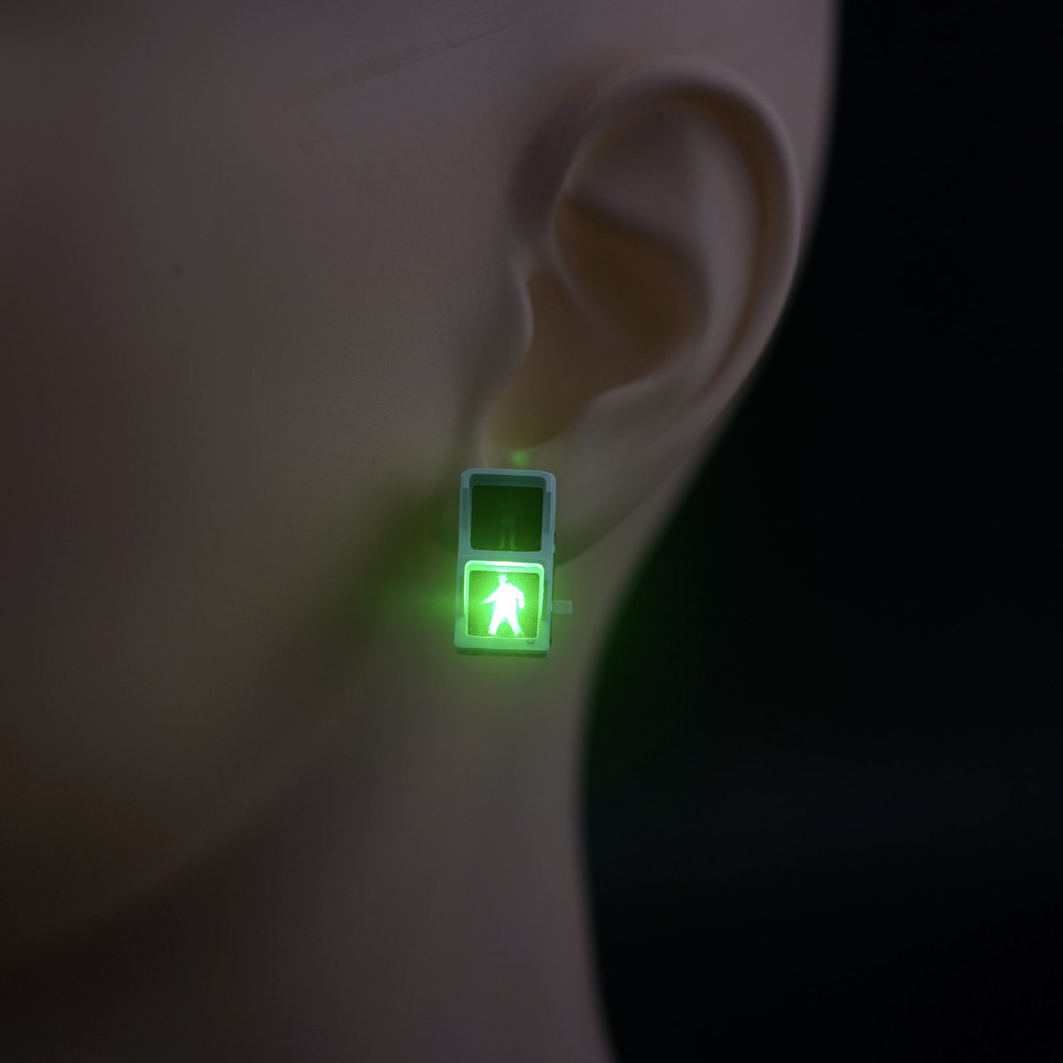 邏輯上其實很簡單,透過耳飾上的機關就能讓號誌燈閃出綠燈、紅燈或是全關閉佈的狀態,隨你的心情變化,在黑夜中更加耀眼,絕對是想高調的朋友想要擁有的款式,不管男生女生都適合配戴。