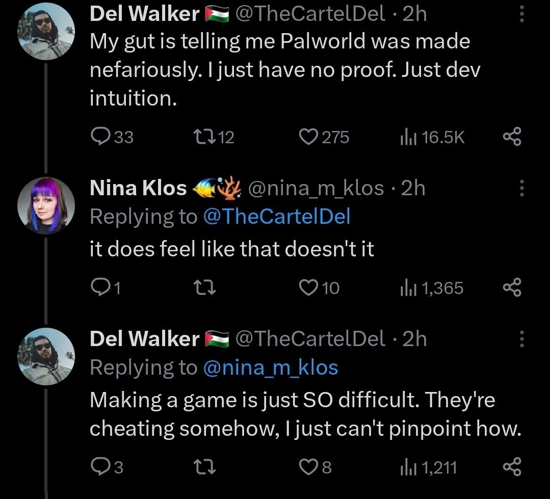 「我的直覺告訴我,《幻獸帕魯》是一種惡意方式所誕生的,雖然我也沒有證據,但就是一個身為開發者的直覺。」Del Walker說,「做一款遊戲是一件多麼辛苦的事情,所以讓我質疑他們是以用某種方式在作弊,只是我沒有辦法去確定。」