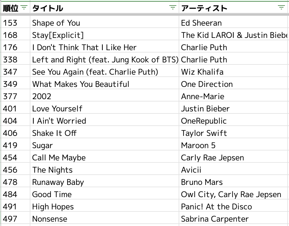 像是國外非常火紅的 Taylor Swift,較新的「Cruel Summer」 與「Anti-Hero」都在 500 名外,居然還是 2014 年的舊歌「Shake if off」收聽最多,相較在鄰近的韓國,這兩首歌都進入前一百名,可以感受到日本音樂收聽的截然不同。