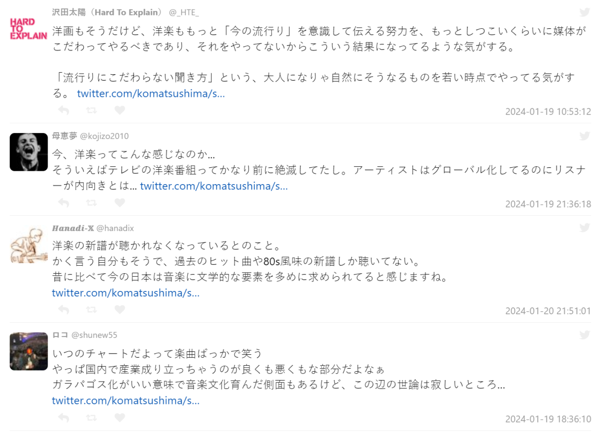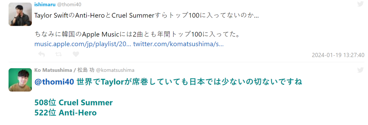 不少網友也指出,對於西洋音樂近來的發展的確頗無興趣,現在日本聽眾喜歡的除了自家日本以外就是韓國的音樂,韓國的流行文化的確在現今非常強勢,從 Apple music 公布的 2023 年日本收聽百大清單,就可以發現裡面多為動漫歌曲與日本流行樂外,就是韓團如 BTS、NewJeans、LE SSERAFIM、Stray Kids。