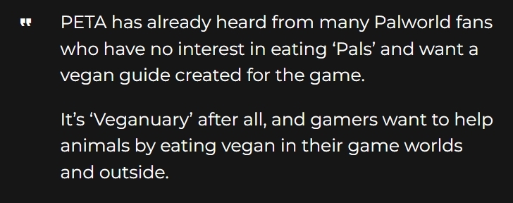 「PETA已經收到許多《幻獸帕魯》玩家的來信,其實他們對於吃掉『帕魯』這件事並不感興趣,甚至還希望開發團隊能夠為這款遊戲打造一個素食指南。畢竟現在是素食月(Veganuary),確實有玩家希望能夠在遊戲世界中,採用跟現實生活中相同的素食料理來幫助這些生物。」