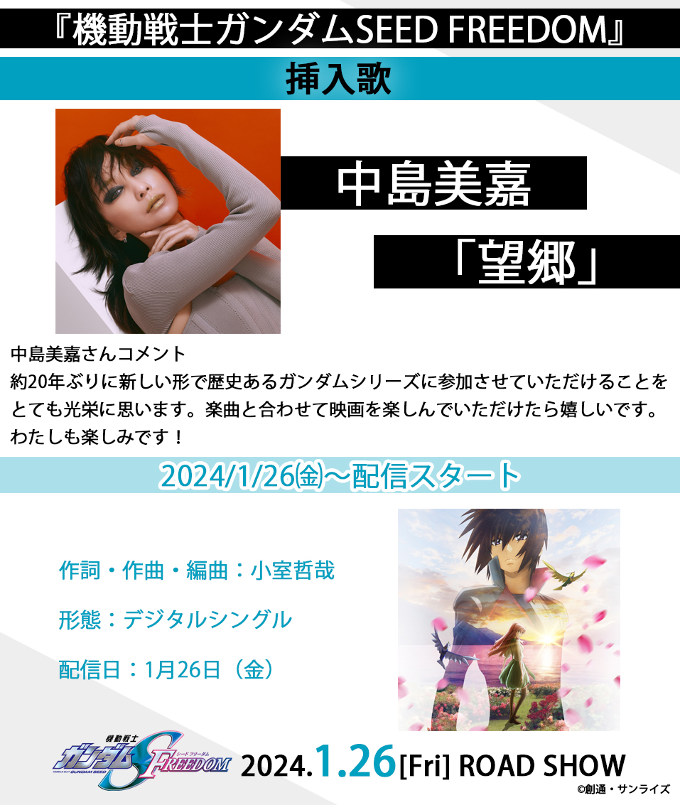 沒想到在上映當日的晚間 0 時,壓軸的公開本次劇場版插入曲「望鄉」,將由中島美嘉獻唱,也是繼電視動畫《機動戰士鋼彈 SEED》,20 年後獻唱。