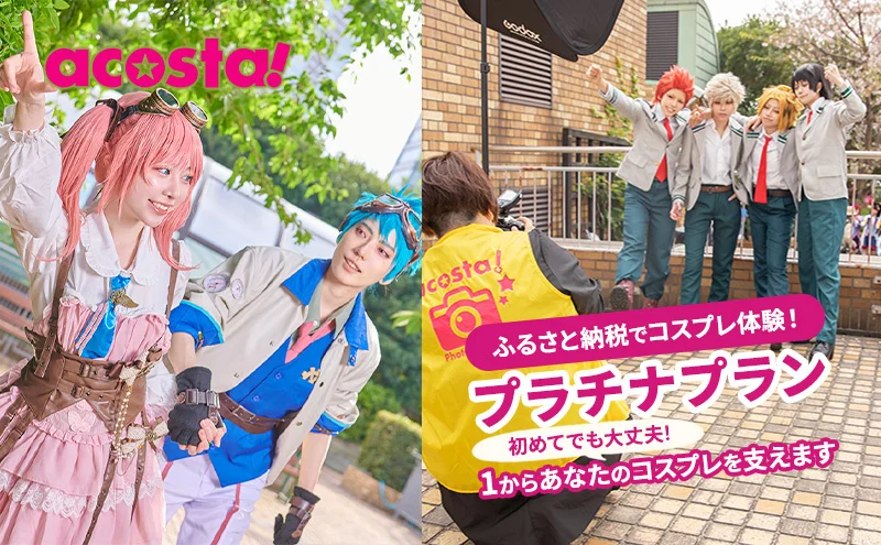 此活動由日本的知名 Cosplay 活動與工作室「acosta!(アコスタ)」 協力,分成Cosplay體驗計畫【白金計畫】 &【黃金計畫】 ,初學者可以空手參與並選擇自己喜歡的角色(配有專業化妝、攝影和規劃制定),讓你享受如專人服務般的 Cosplay 體驗,感受其中的樂趣。