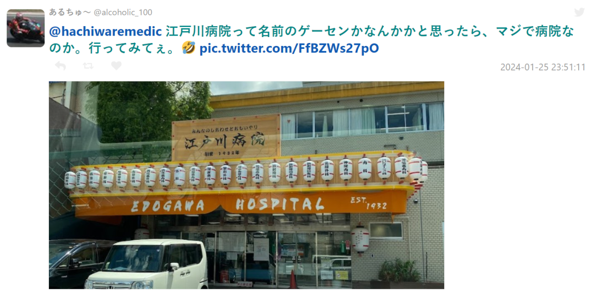 除了院內的佈置外,也有網友分享江戶川醫院的門口樣貌,戲稱這邊看起來很像遊戲中心,不太像是醫院,給人有種截然不同的風情。( 醫院佈置似乎也會隨時間更新 )