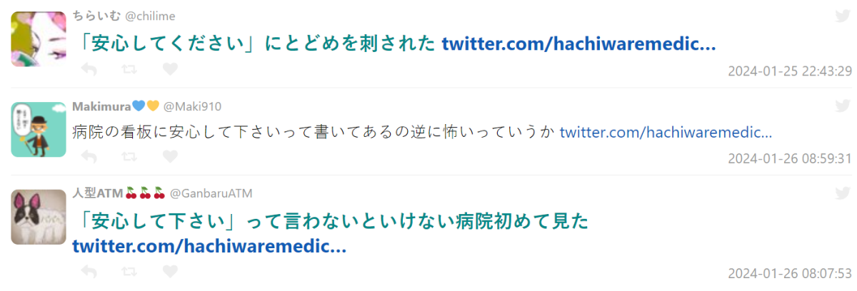 不過網友也發現在急診室的外頭看板寫著「請安心」讓人感覺是不是這樣的外觀會讓人感覺不專業,擔心醫院的技術不好。亦有住在該處的網友解釋,的確有人會這樣想,但其實這間醫院評價很不錯,活絡的氛圍讓小朋友不會害怕。