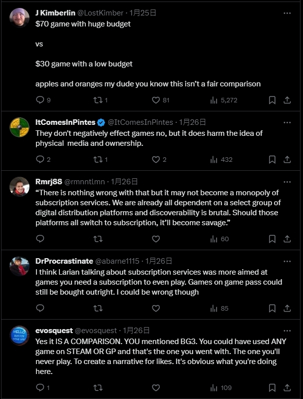 只不過,對於PeterOvo所表達的論點,實際上也並非所有玩家都能夠接受,即便是同樣喜歡《幻獸帕魯》的玩家,他們認為這與《柏德之門 3》比較不僅是沒有意義的事情,且兩款遊戲的售價有不同,這樣的比較也並不公平。再加上,訂閱制也確實對於實體遊戲、開發商造成實質的影響,並不能因為《幻獸帕魯》的個案,就否定拉瑞安工作室的論點。