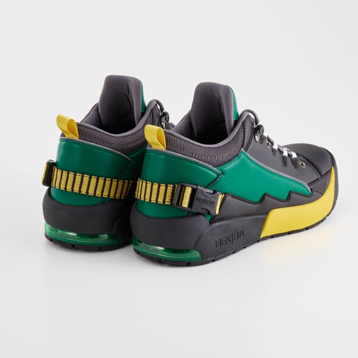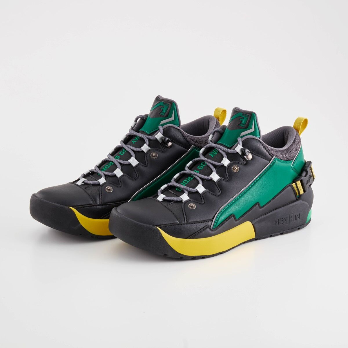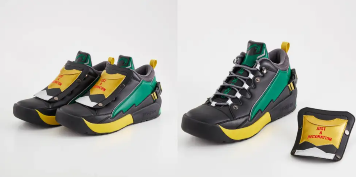 這次推出的造型球鞋,以零神身上的黑綠黃配色與線條為靈感打造,鞋後跟有著象徵零神身上黑黃裝飾的織帶與扣具,拆卸下來可以看到藏在鞋跟的文字「LOVE & REASON」、「FLOWER」。