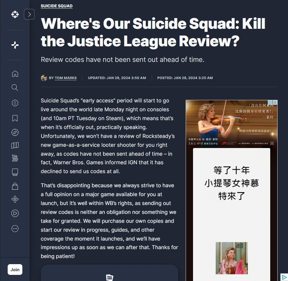 不過,眼看《自殺突擊隊:戰勝正義聯盟》「搶先體驗」將在2024年1月30日於全球上線,電玩媒體《IGN》卻在日前罕見發文,表示他們至今為止尚未得到來自華納兄弟互動娛樂的「評測代碼」,甚至應該更準確地說,官方表明拒絕向該媒體提供代碼。