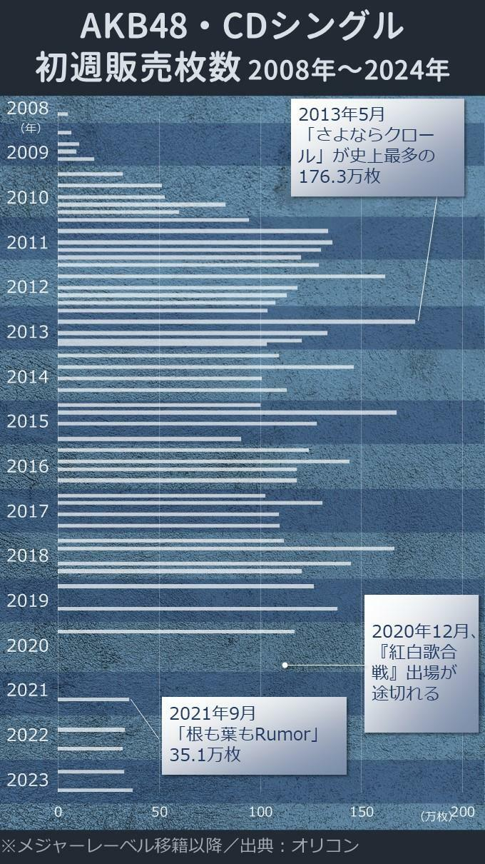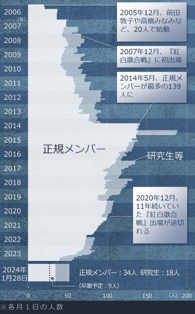 報導指出,AKB48 的存在感日漸衰弱。最受關注的話題通常是成員的畢業公告,且近期還有不少成員規畫準備畢業,事實上,自前幾年疫情爆發以來,團隊成員數量已大幅減少。三年前,2021 年 1 月時,還有 99 人,但現在(至 1/28)只有 34 人,如果再加上未來畢業的人數,可能僅剩不到 25 位成員。