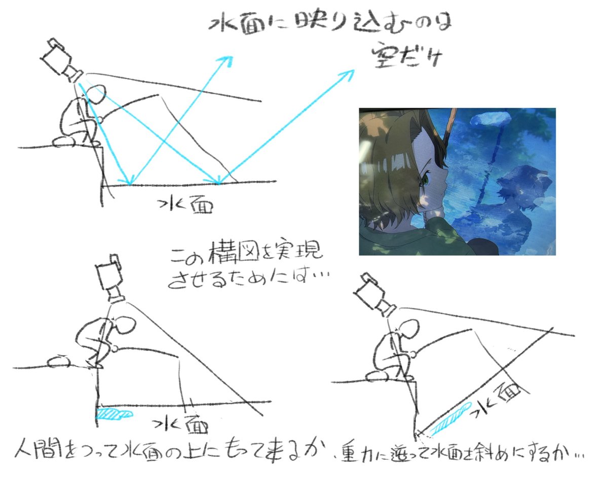 他甚至還畫好了示意圖,可以看到左上角顯示的是「根據光的折射,攝影機真正應該顯示出的畫面」,也就是水面上只會反射出天空的倒影。