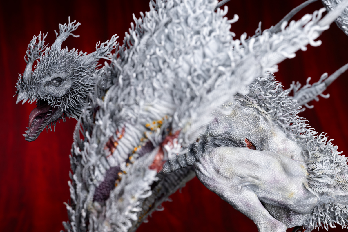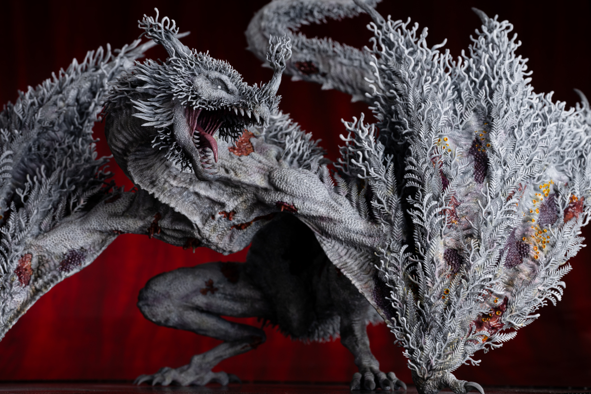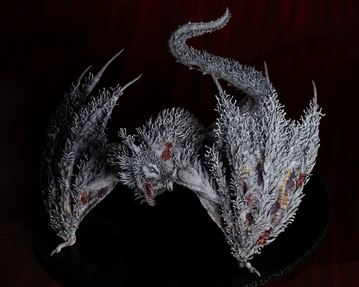 針桐雙一所雕塑的艾格基斯套件採用 3D 列印、樹脂翻膜混搭而成,以寬約 45 公分的尺寸再現於地面爬行的魄力姿態,細膩雕塑出遭到猩紅腐敗侵蝕的異樣雙瞳、極具生物感的鱗片與肌肉紋理、覆蓋全身的白色菌絲與淌著鮮血的潰爛皮膚。全身造型細膩、密度極高的菌絲零件令人驚豔,不過製作時也需要更多的耐心、細心與技術來打磨細小的零件。