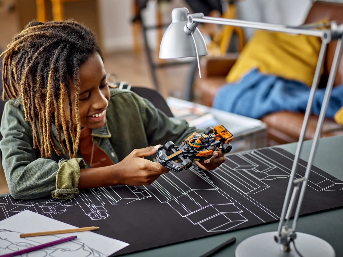 看到這台車,不知道各位玩具人是不是跟小編一樣感覺非常的熟悉呢?那肯定是因為你心中還惦記著科技(Technic)系列編號 42141 的「麥拉倫一級方程式賽車」!本次在極速賽車以 245 片零件樂高化、根據 2023 麥拉倫 F1 賽車設定製作的模型組完之後長約 19 公分,高度則是 4 公分左右,除了還原黑色搭配木瓜色的鮮豔車體之外,更以大量貼紙再現了豐富的贊助商 LOGO,不過小編個人認為最讚的是輪圈印刷件與特製輪胎,加上各種弧形件的運用,讓整體達到逼近實車的優美線條,不愧是紀念麥拉倫車隊成立 60 週年的商品。