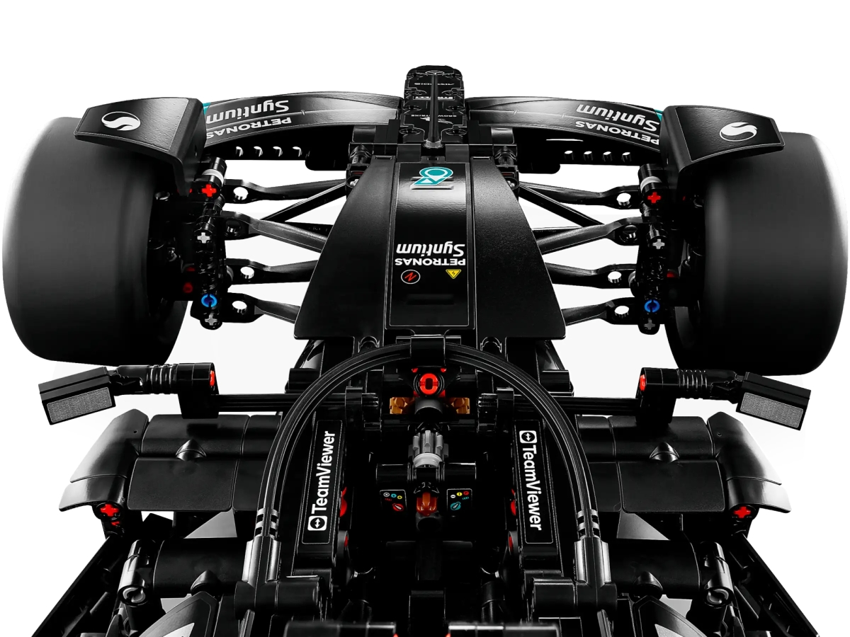 再來是可玩性的部分,這台 W14 不只搭載科技系列常見的方向盤&車頂旋鈕帶動之轉向功能、差速器、具備可移動活塞的六缸引擎(需拆開引擎蓋),還有依照現實 F1 賽車 DRS 技術所打造的可變尾翼;值得一提的是,在 2024 年 3 月發售的三款 F1 賽車,其輪胎都將以接近光頭胎的造型呈現,超讚!