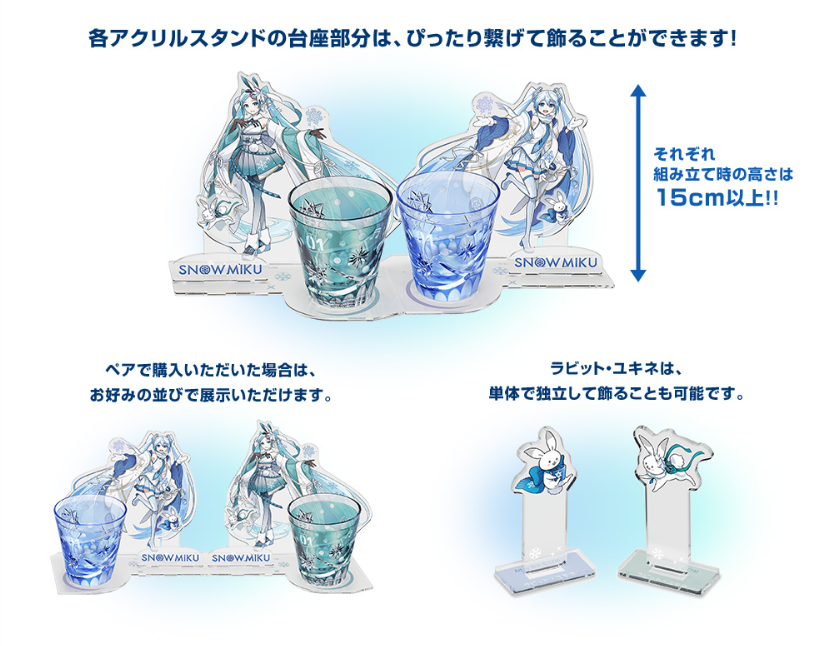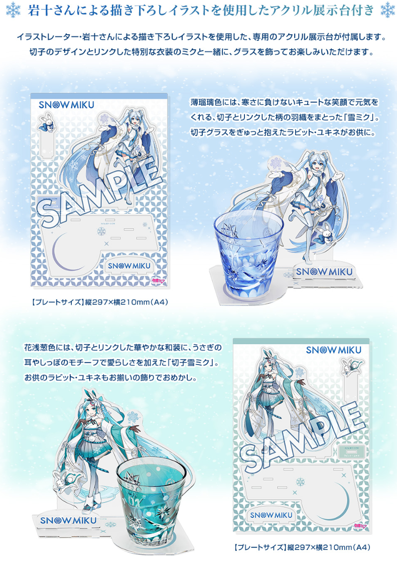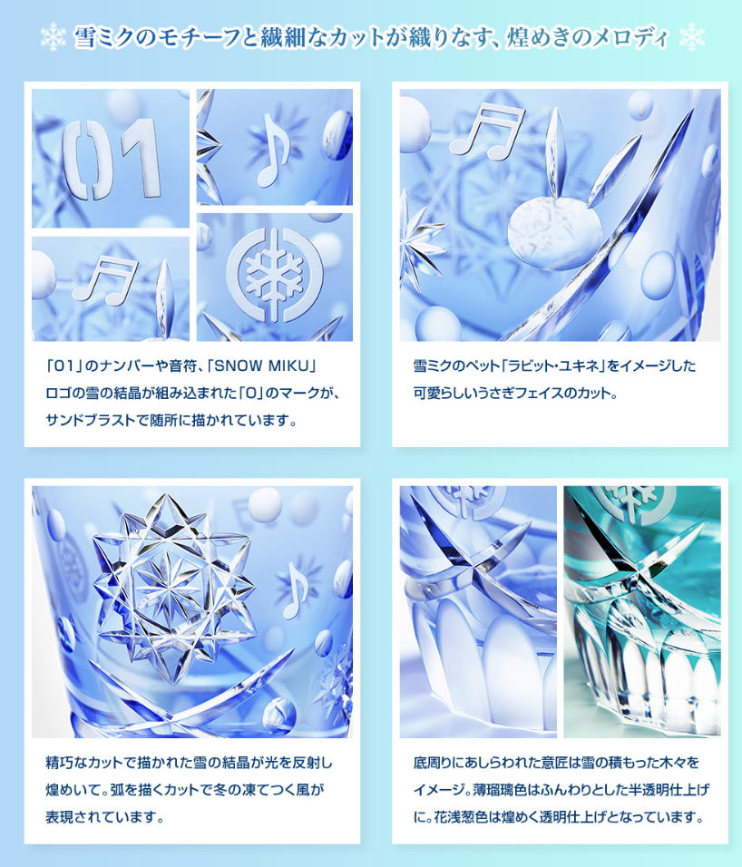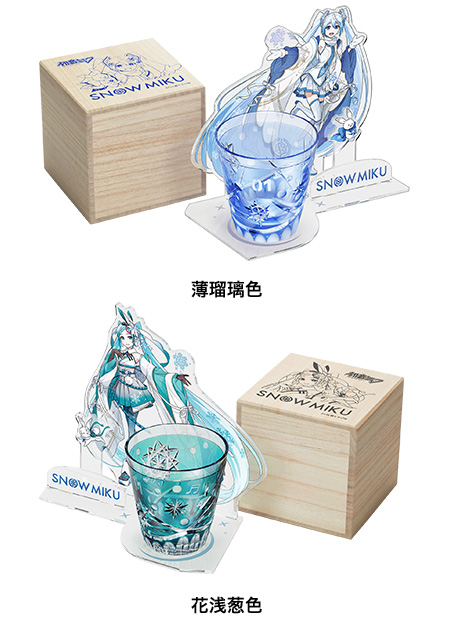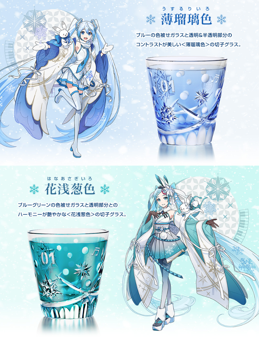 玻璃杯這次有兩款顏色,分別為 : 薄瑠璃色(うするりいろ)與花淺蔥色(はなあさぎいろ),杯子上有著冰雪般的結晶圖案,以及代表雪初音的吉祥物「ラビット・ユキネ」浮現在杯子上,搭配初音的音樂特色圖案以及 01 數字,給人目不轉睛的絕美效果。