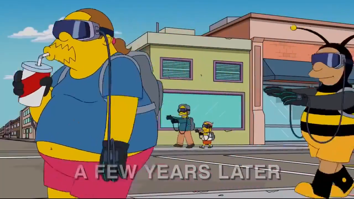 從Twitter(現稱X)網友所分享的《辛普森家庭》片段中可以發現,裡面的人們同樣也是將VR/MR裝置佩戴在臉上,並且在路上到處走動,而這一畫面幾乎與這幾天的社會現象一致。