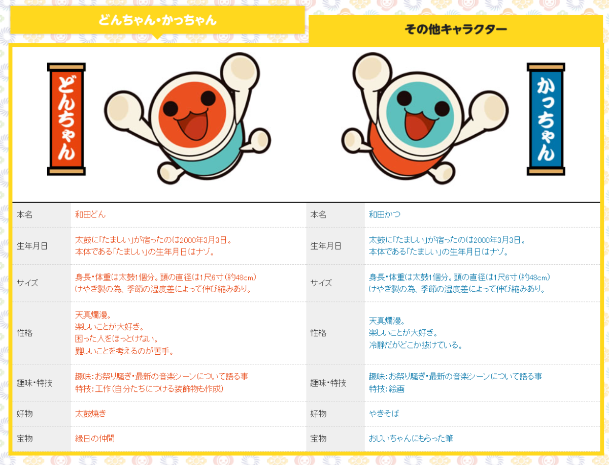 事實上在太鼓達人的官網上就有介紹兩位的來由,甚至細項的介紹也不少,不過這似乎是遊戲初期的設定,後續也比較沒有強調,看來都被不少玩家遺忘了 XD。