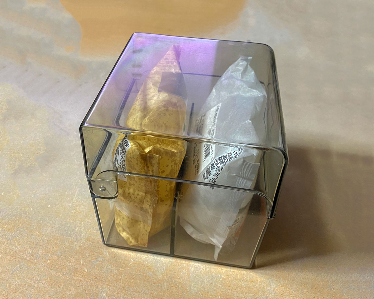 只要將盒子重新洗乾淨就可以使用,剛好便利商店的三角飯糰大小能夠放進一個槽,共可放兩個,之後再稍微包好後就能帶出門吃,到了目的地就不會看到被身體和背包壓爛扁掉的飯糰了。