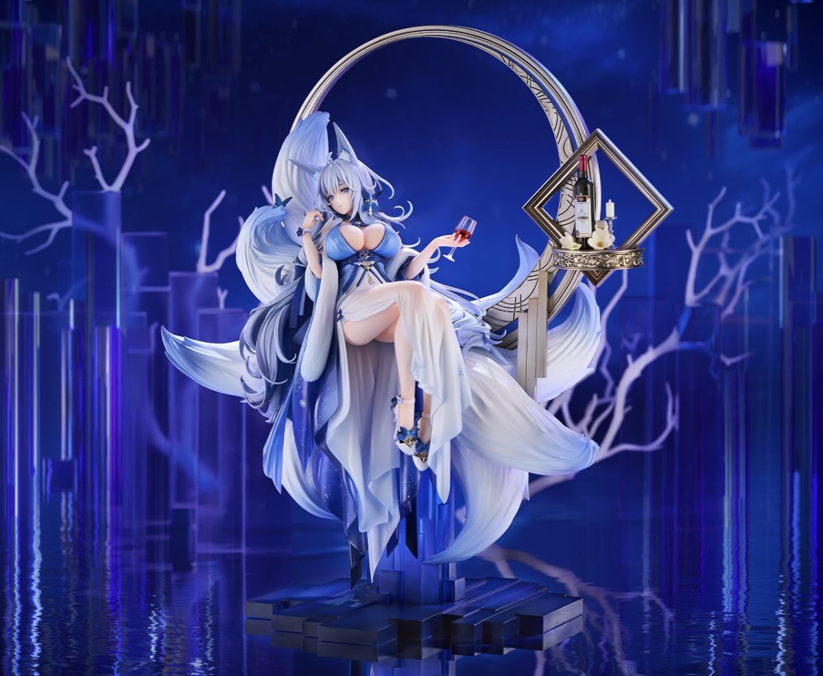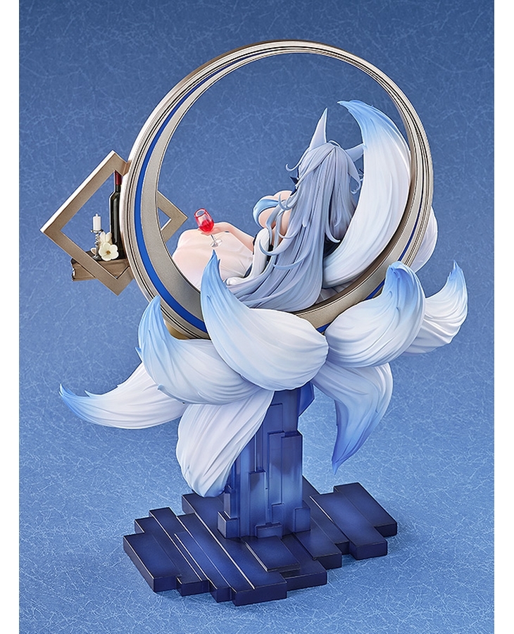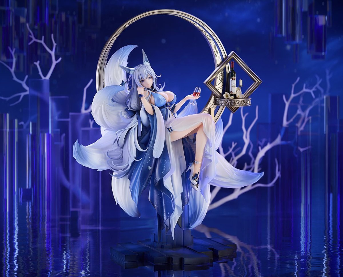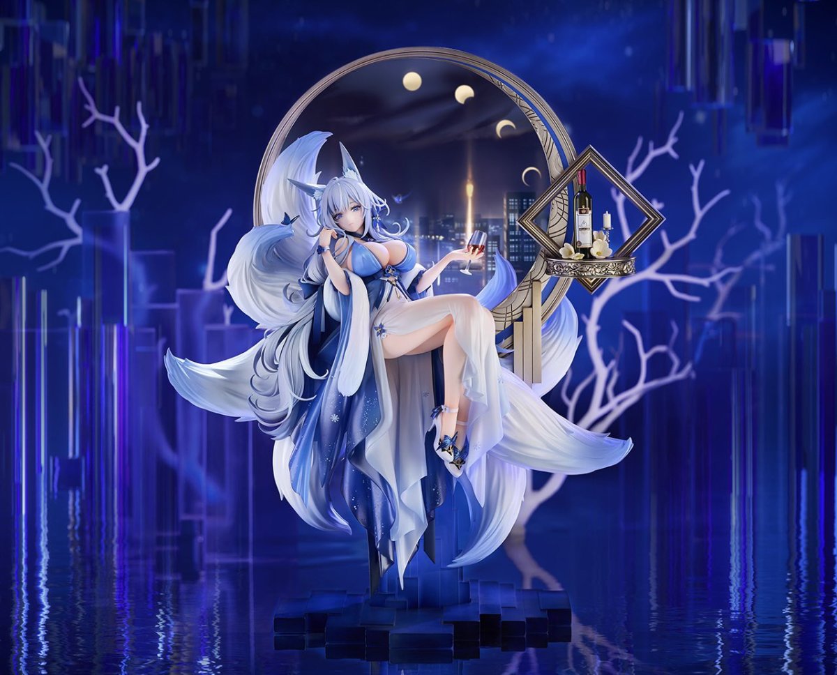 本次以遊戲中「朧月十夜」為題製作的信濃高約 33 公分,再現了她手持酒杯、另一手撥弄著淡藍色長髮的造型,並將狐狸耳朵、以金色裝飾點綴的禮服、高跟鞋,與胸前的圓潤曲線仔細形塑,白皙的柔嫩肌膚、採用透明材料打造的裙子帶出一股優雅的輕透感,豐厚的尾巴更傳達出軟綿綿的視覺效果,加上刻畫出細緻紋理的金色圓框、擺著酒瓶與鮮花的小架子,各位指揮官,還不把這尊信濃帶回家跟您一同暢飲一番嗎?