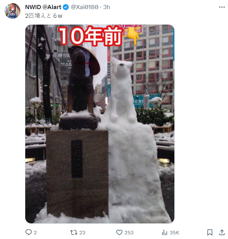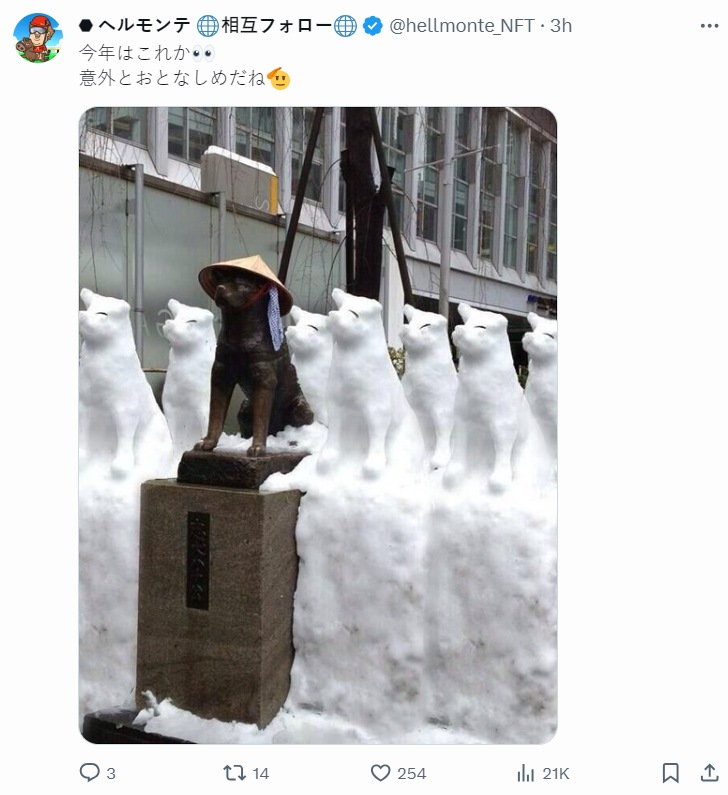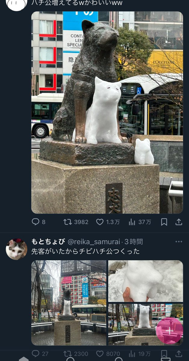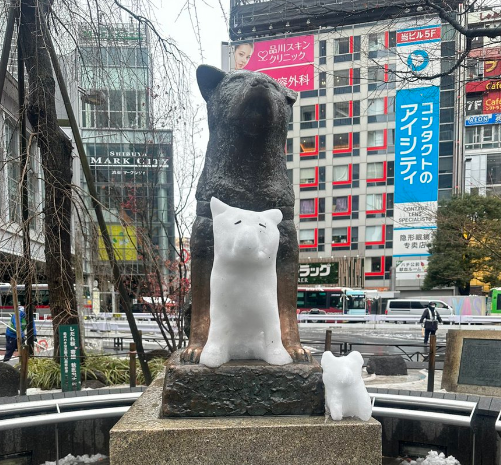 不過在 X 上有暖心的小故事引起討論,就是位於澀谷車站前的地標「忠犬八公」銅像,有名善心推主看到在大雪中仍佇立在此的小八,決定替他用雪製作夥伴來陪伴牠,分享到 X 上後也引起廣大迴響,不到 6 小時就已超過 10 萬讚數。