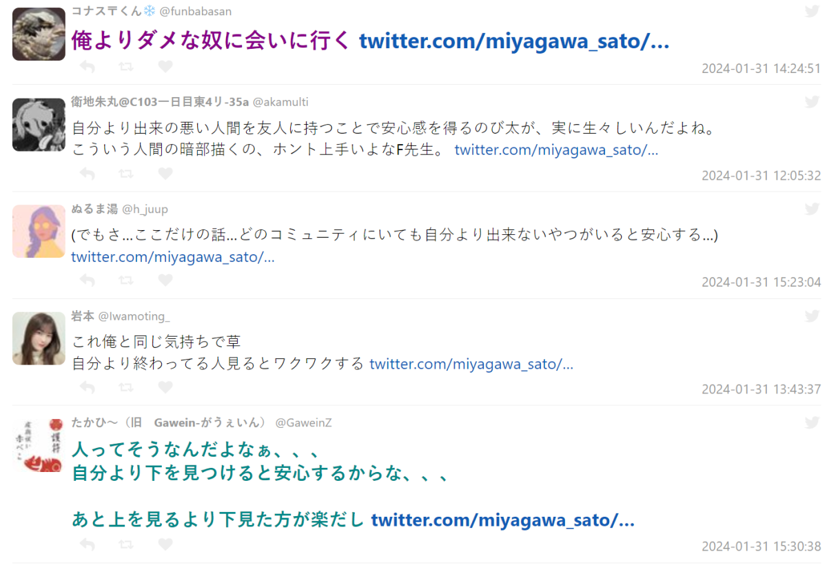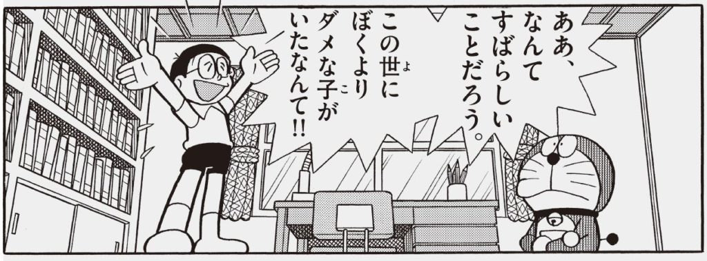 網友也指出《哆啦A夢》非常多深刻寓意的內容,很多都是長大才會理解。像這篇「最後一名不是我」就體現了人的黑暗面,大雄的安全感來自於和比他差的人做朋友,也就是他終於有可以欺負的對象,與真實人們的相處如出一轍,當你自己發現有人比你還要糟糕時,反而會自滿且藐視在自己底下的人。