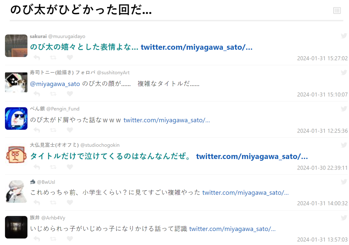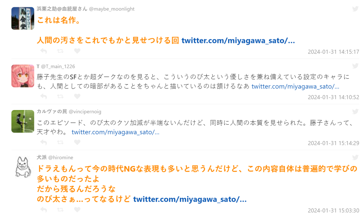當然這些回數都已經很久以前了,連日本網友都發現這是以前小時候看的東西,沒想到在《哆啦A夢》中藏有這種人性描寫的內容,當然藤子·F·不二雄其它作品有更多類似的手法,或許各位有機會翻翻藤子·F·不二雄的漫畫時,也能感受到那種小時不懂長大有體悟的啟發。