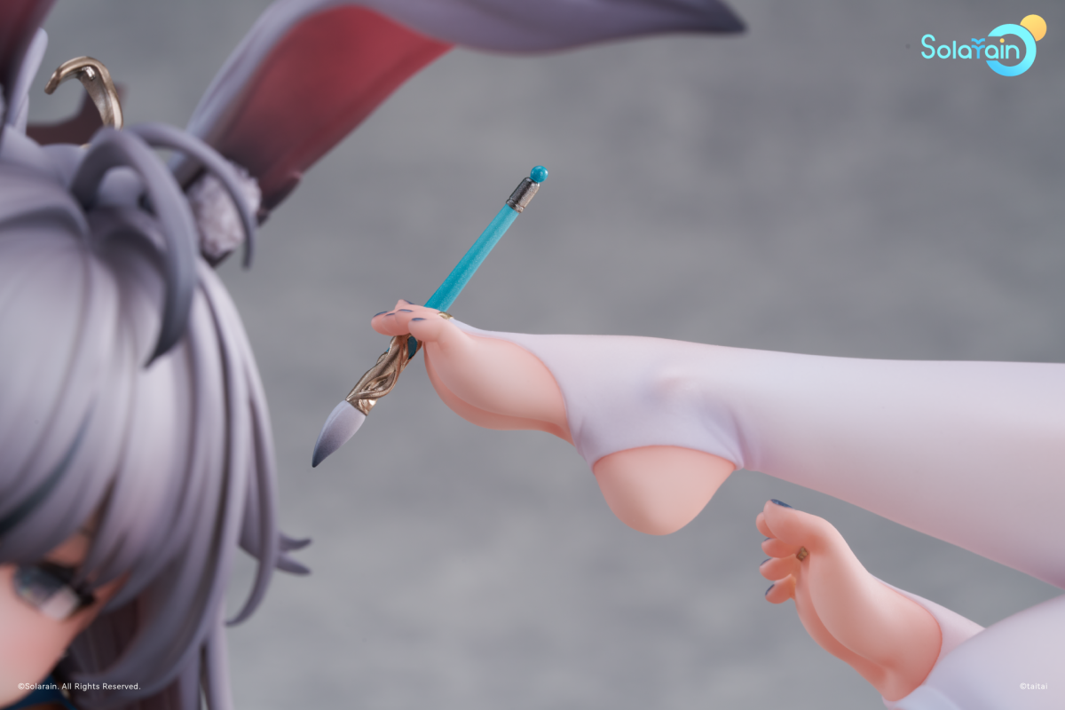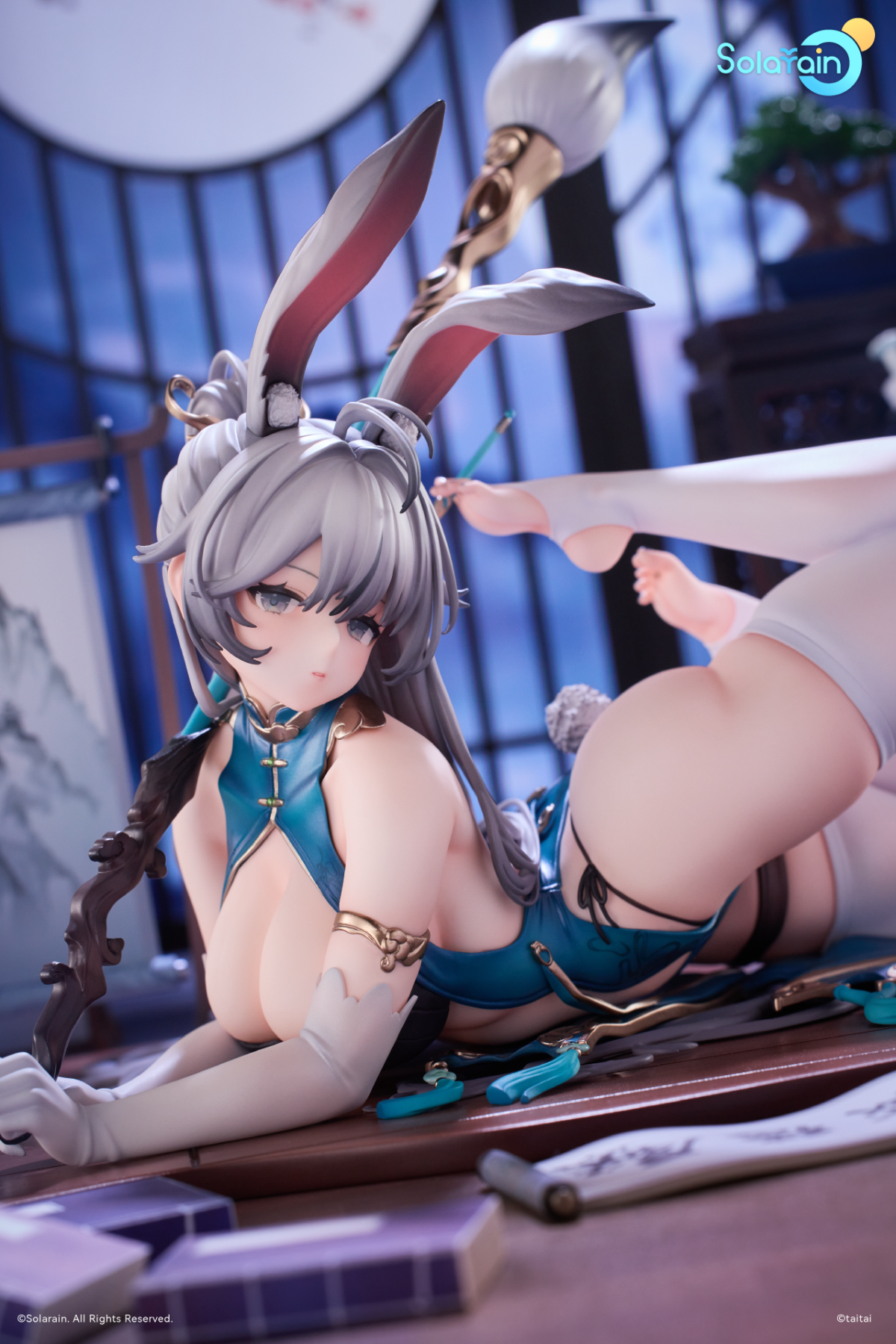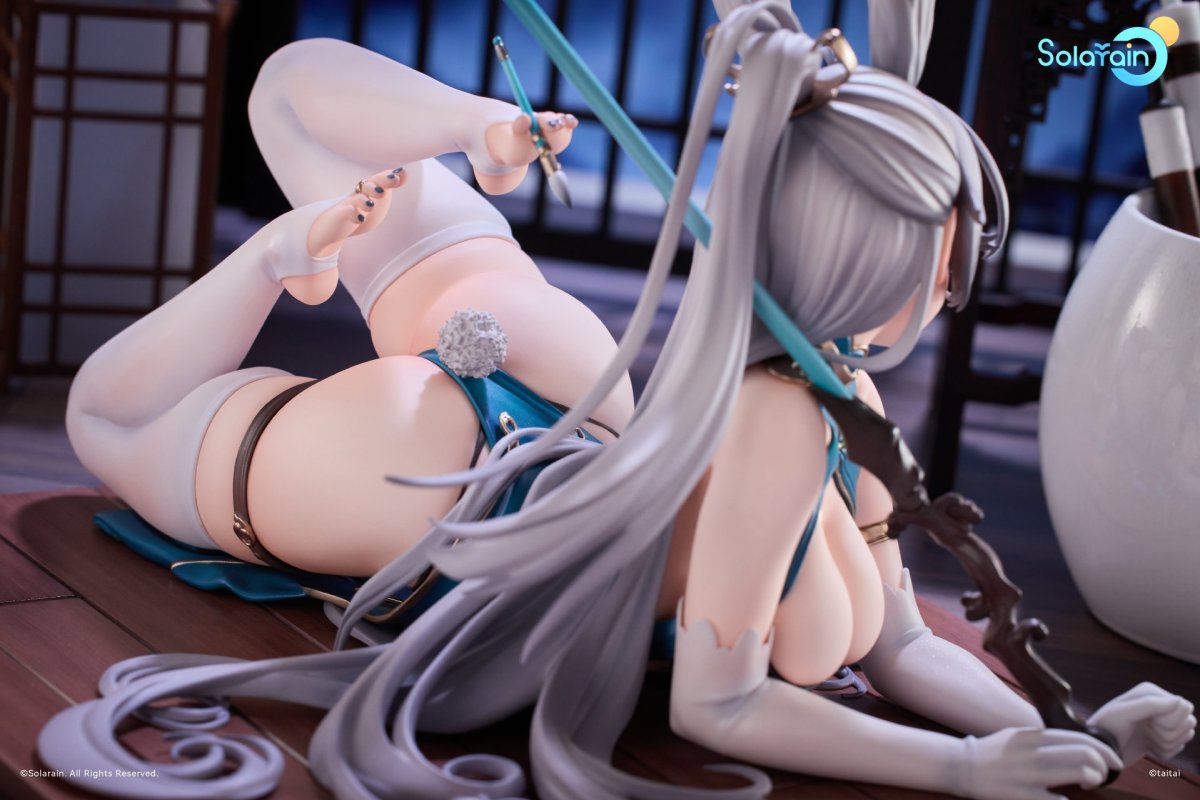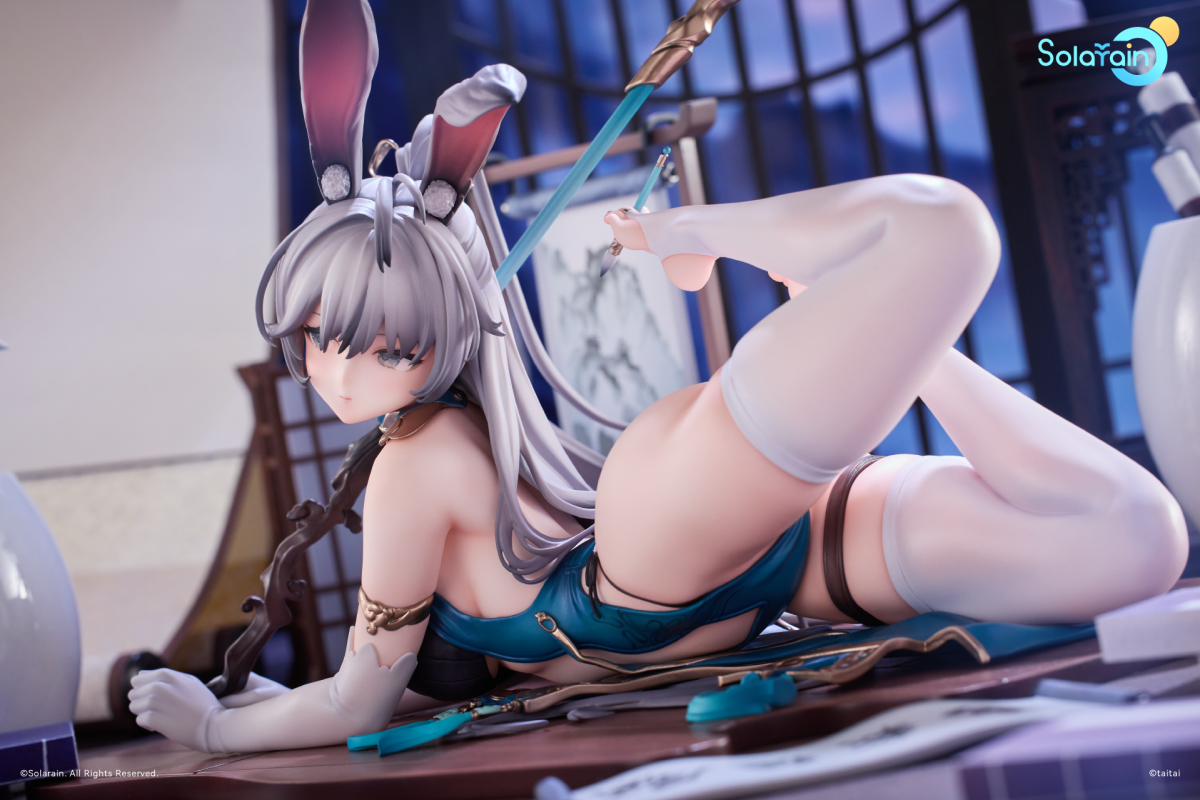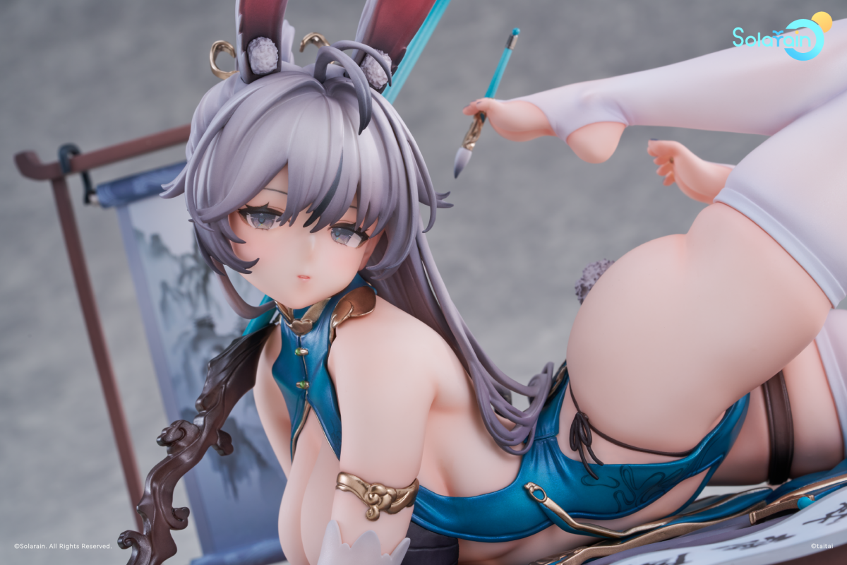 雖然已經邁入 2024 的龍年,不過白嫩性感的兔女郎誰不愛呢?本次立體化的鏡月身穿露出度極大的藍色高衩旗袍與白色透膚絲襪,以雙腿彎曲的性感趴姿處於木板樣式的底座上,光是柔嫩白皙的肌膚、呼之欲出的巨乳、渾圓豐滿的臀部,以及遭到擠壓的肉感大腿就已經相當性感,加上長髮、兔耳、白手套......等元素實在令人招架不住!除了辣到不行的鏡月本體之外,本作的另外一大亮點即是巨大的毛筆與左腳腳趾夾著的毛筆,不僅有著精彩的墨水滲透表現,也大大增添文學才女的書道氣息。