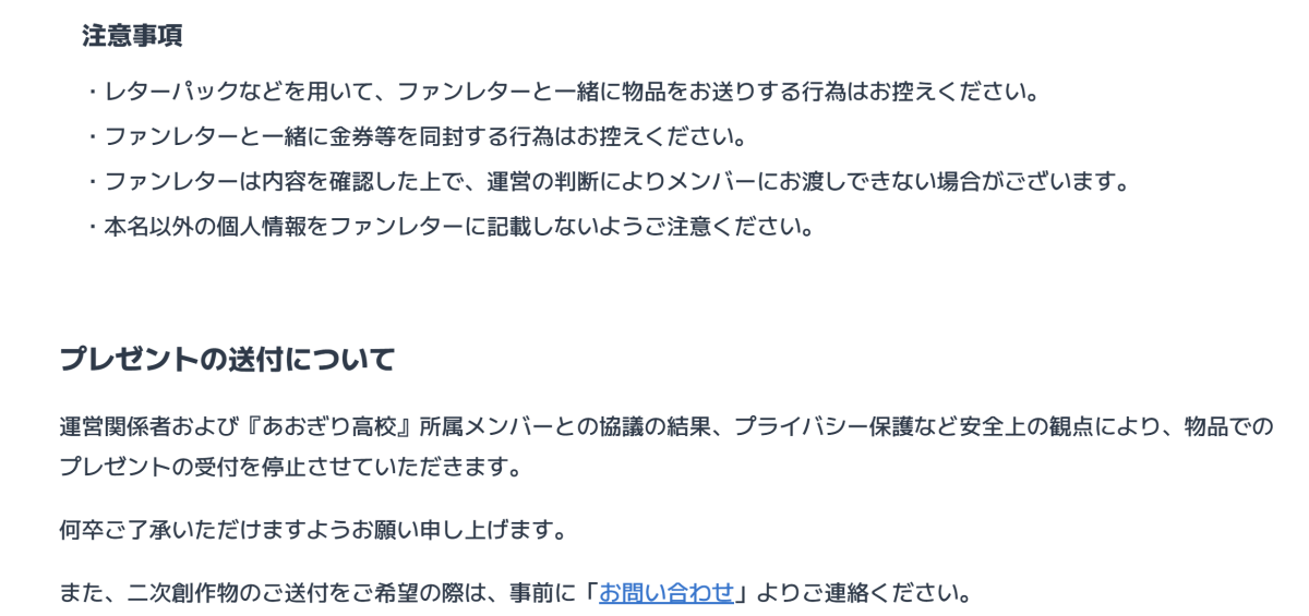 不論是偶像還是現行風行的 VTuber 直播主,都有粉絲贈送禮物的規範,有參加過偶像見面會的,像是食物、玻璃易碎物、高價物品都可能在禁止範疇內,避免造成不必要的困擾。