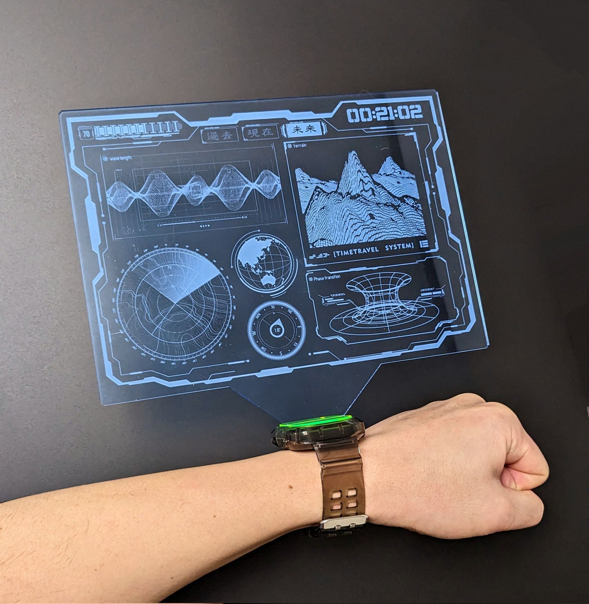 而這主要是利用Apple Watch的保護殼來製作的,說是投影介面實際上就是可替換的壓克力板,不過看起來就是比一般的手錶好玩許多。另外還能裝上其他壓克力立牌,宛如人物投影一樣,網友們都驚嘆「這就是未來啊」。