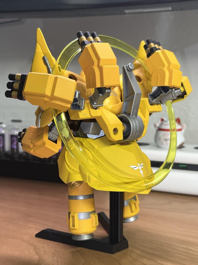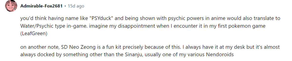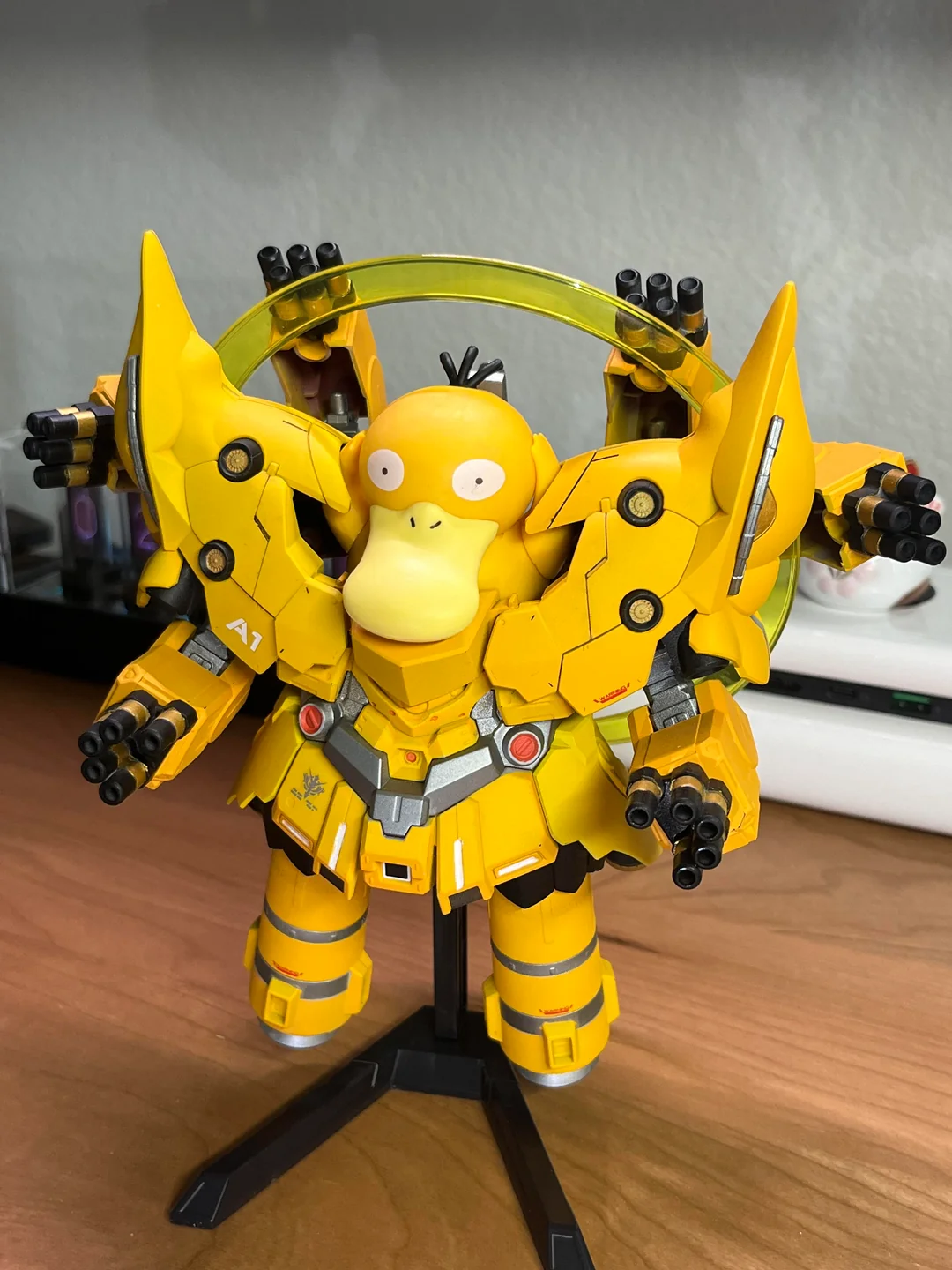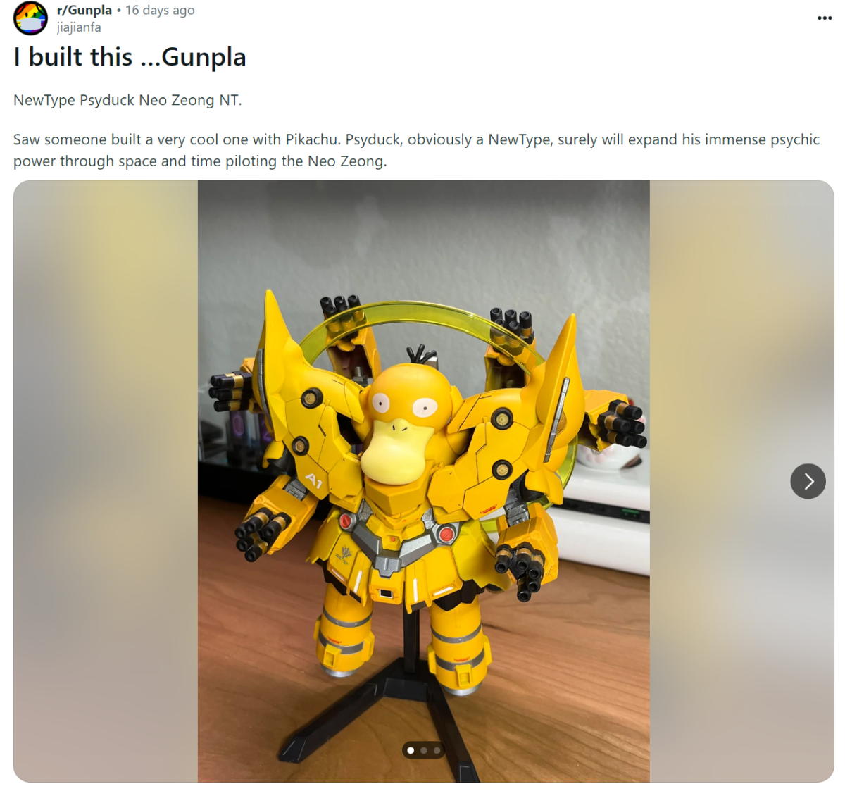 事實上他是在 aliexpress 上面看到結合寶可夢的新吉翁克玩具,覺得這個概念很酷,但似乎都不是正版商品,決定自己做一個。想到駕駛新吉翁克的勢必是個新人類,想到適合的寶可夢就屬在動畫以念力著稱的可達鴨,就拿自己的 SD 新吉翁克塗裝成黃色基底,並放入可達鴨進去看起來超適合。
