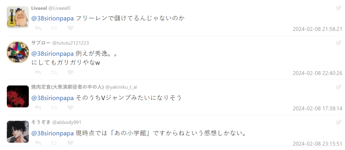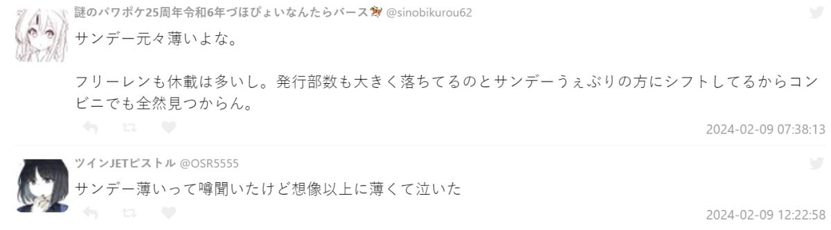 不少網友也開玩笑,說現在這本基本上是靠《葬送的芙莉蓮》在撐,由於《名偵探柯南》現在連載也不穩定,銷量又是三大週刊最差的一個,甚至有被《週刊少年Champion》趕上的趨勢。加上近來漫畫《SEXY田中小姐》作者蘆原妃名子身亡的事件延燒,許多粉絲對小學館非常失望,這也更讓人沒有支持的動力。