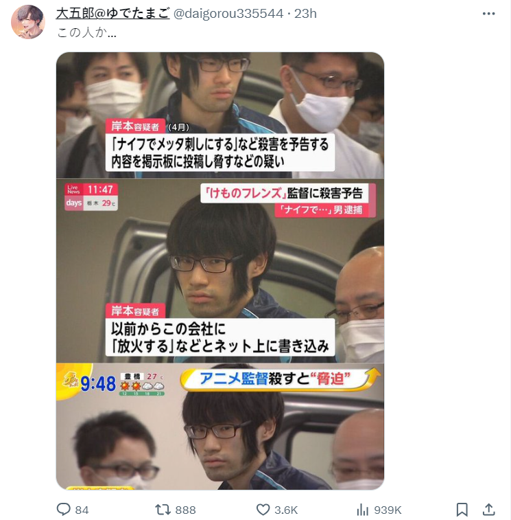 不過這名犯人的照片和名字曝光後,被網友發現這個犯人在 2020 年也曾針對漫畫界人士發表過殺害預告而被捕,當年他才 21 歲,沒想到這次又因為同樣事件被抓,且面容裝扮甚至衣服都幾乎一模一樣。現在已經 25 歲了,已經是慣犯等級,讓人不寒而慄社會怎麼會有這樣的人累犯不窮。
