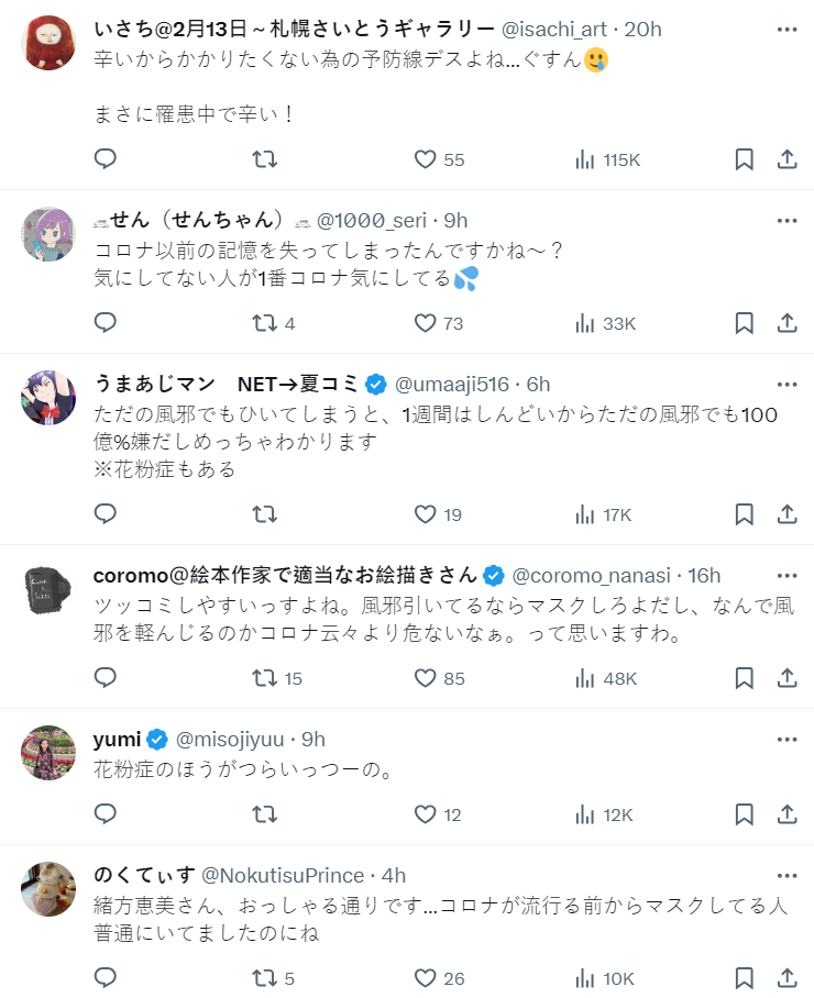 粉絲們也非常心疼緒方大姊的遭遇,尤其身為聲音工作者的她不得不保護好自己的喉嚨,當然日本雖說本來就很多人習慣戴口罩,但或許口罩對於某些場合來說有些人認為不太禮貌,甚至會出言辱罵,這樣的情況也有網友遭遇過。
