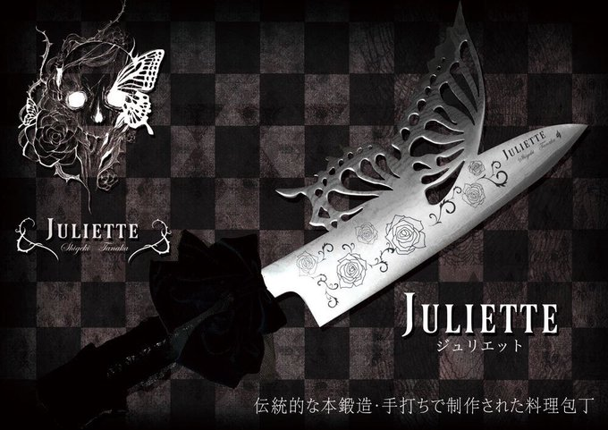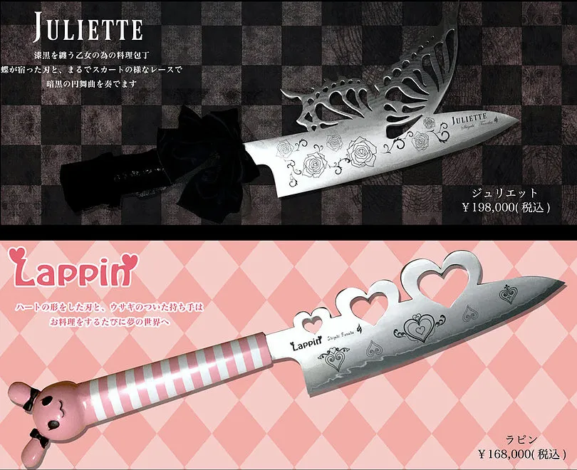 當初推出 「蘿莉塔包丁廚刀」外,還有「哥德蘿莉塔包丁廚刀」 共兩款,以傳統刀藝製成,刀的本體特別製作成特殊的形狀,搭配上面的圖騰與特殊握柄,本來要價就不斐。