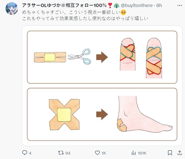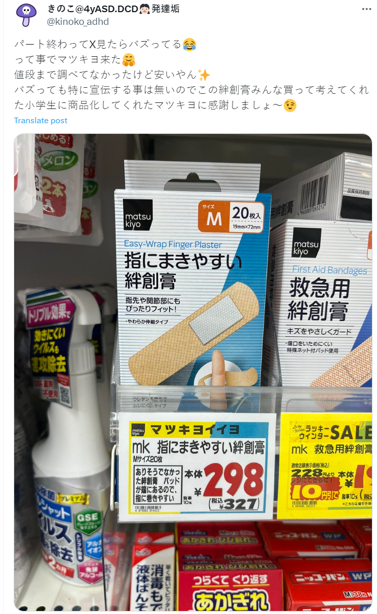 不過日本 X 上有網友貼出,一個由小學生發想的創意作法,把「OK繃紗布位置移動」後的產品,似乎更好使用,手也不容易沾黏,更可以簡單把傷口包紮好,這樣的點子居然是小學生想出來的,也成為網友熱議話題。