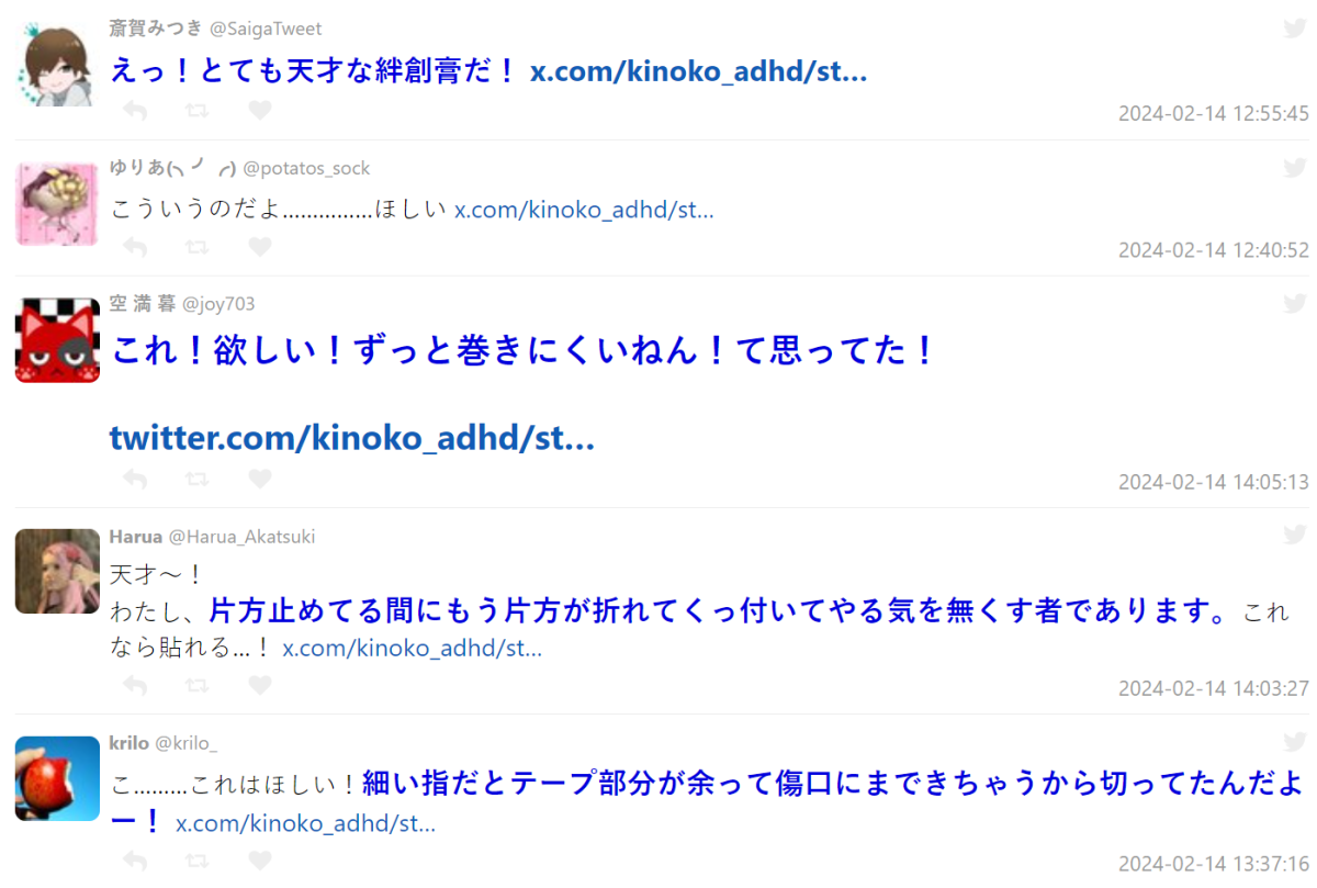 發想的小學生也曾受朝日新聞採訪,她表示對孩子來說,纏上 OK 繃是很困難的,將紗布部分放在傷口上並包裹時,膠可能會被紗布纏住,或會粘在一起。所以她發想了這樣的點子,讓孩子也可以輕鬆使用,不會弄得亂糟糟的。