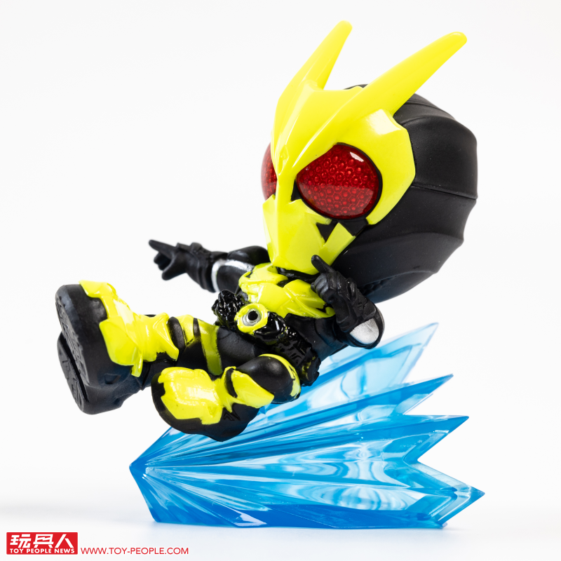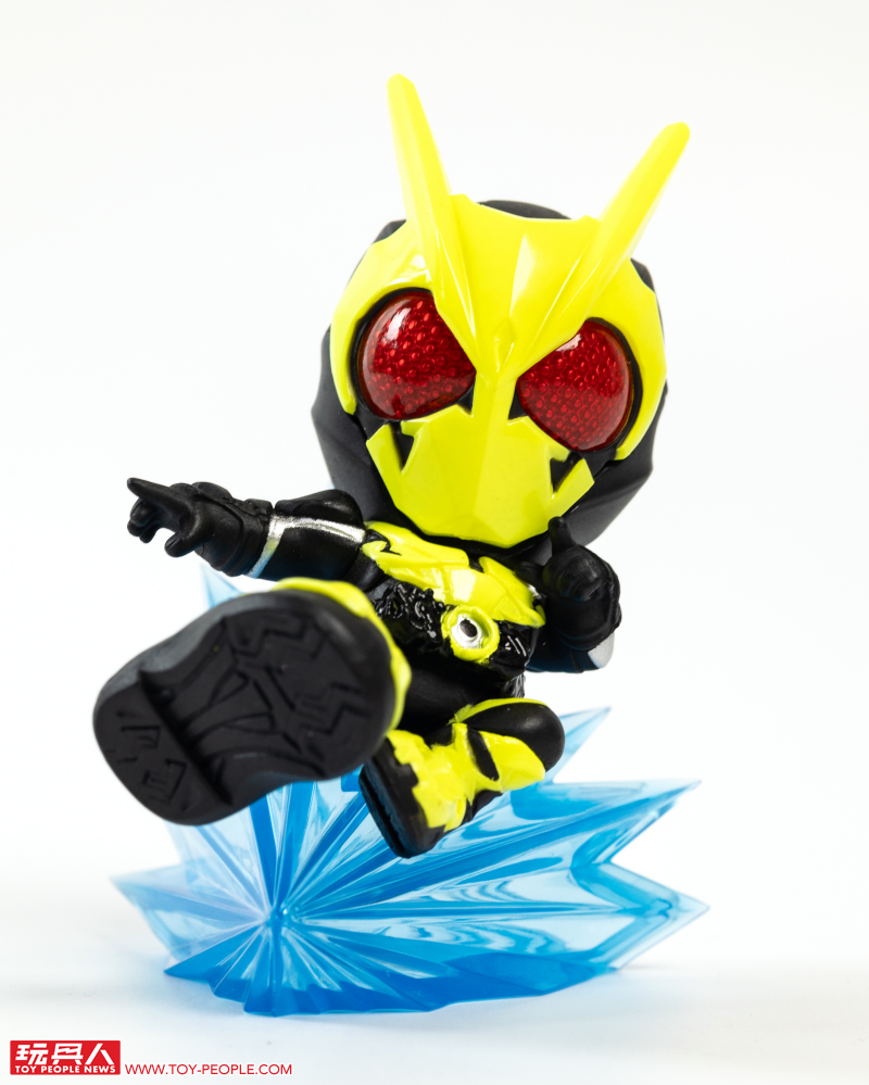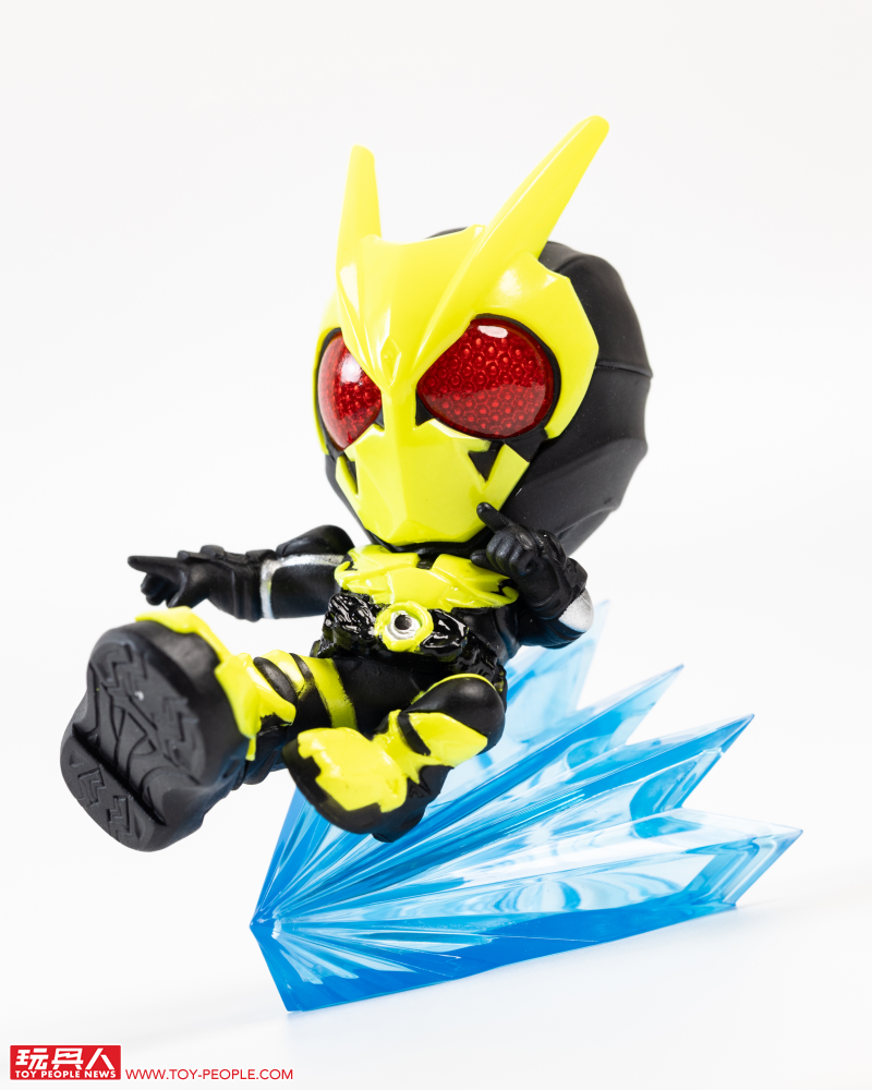ZERO-ONE 躍昇蝗蟲形態搶眼的螢光綠裝甲、施展騎士踢必殺技 Rising Impact 時的招牌手勢都考究還原。