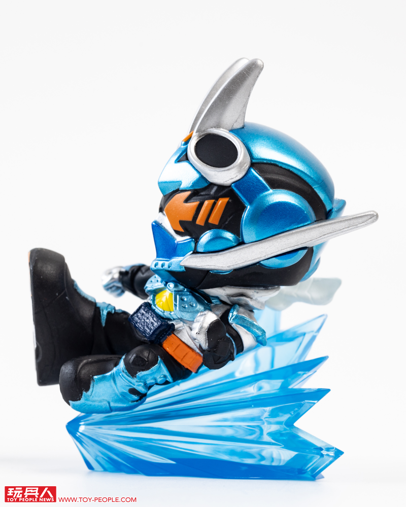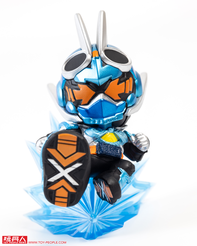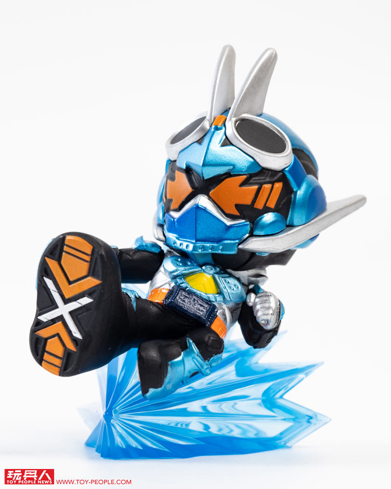 最後就輪到令和第五作的假面騎士GOTCHARD 蒸汽蝗蟲形態,整體除了對比鮮明的橘藍配色之外,更以銀、黑色點綴,加上頭部的銳利感、腳底的色彩、整體豐沛的造型密度,都讓這款騎士在視覺上有著優秀表現。