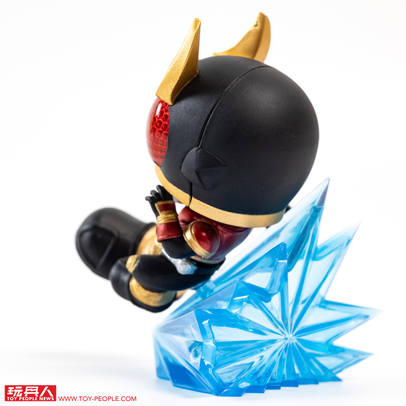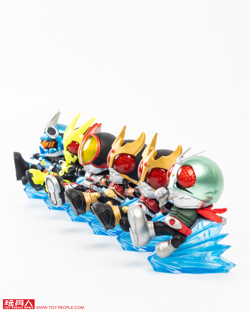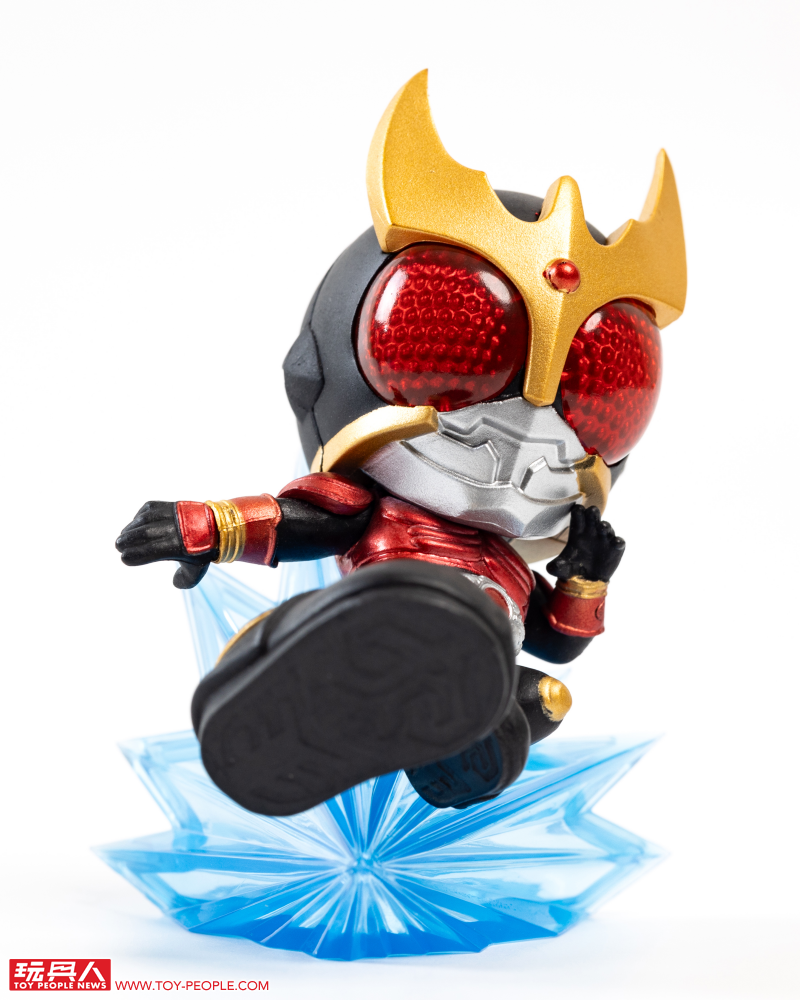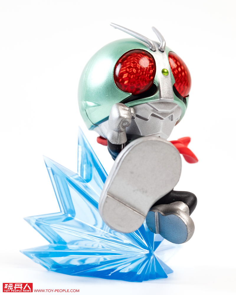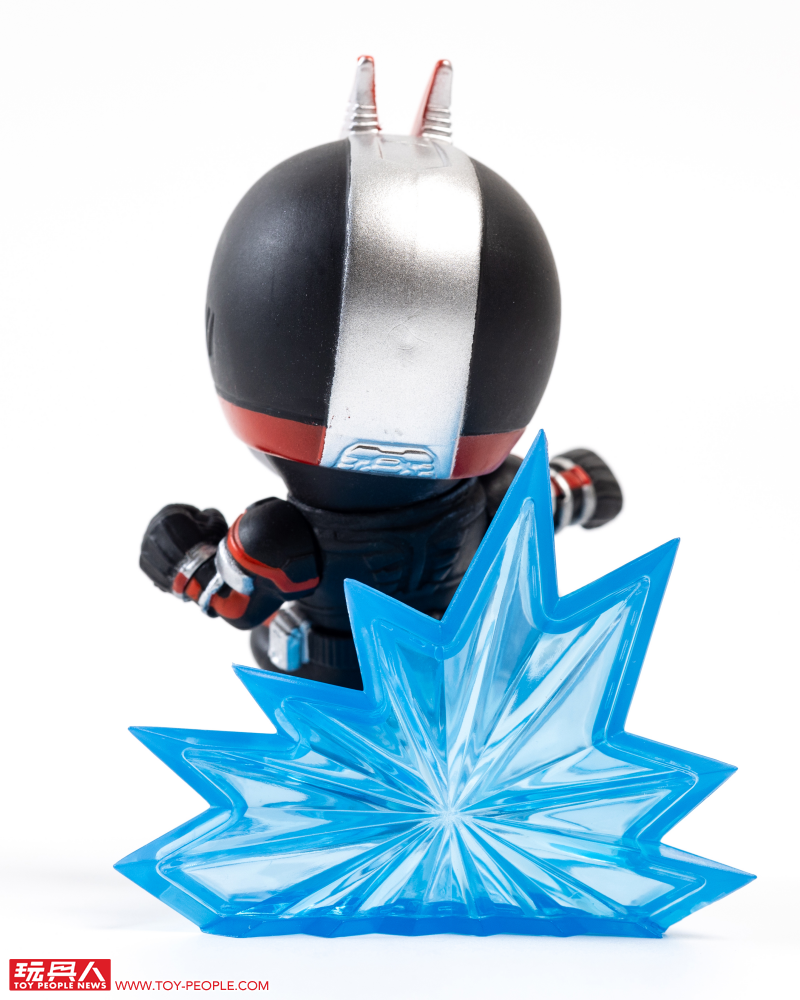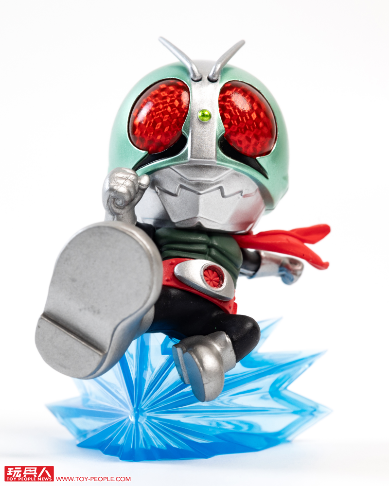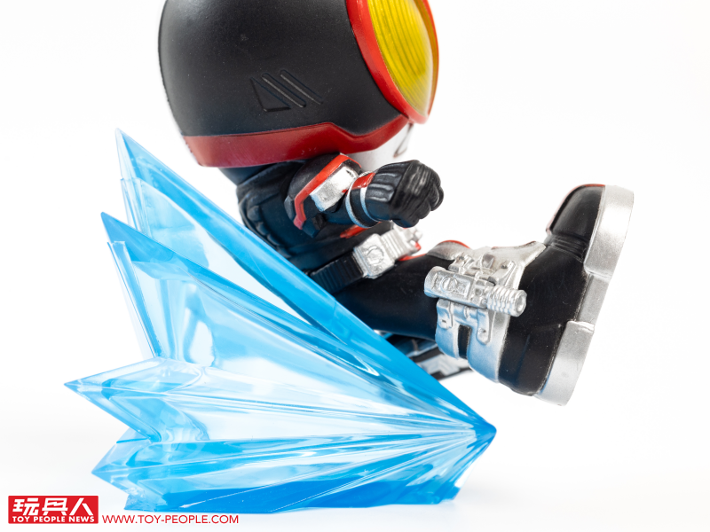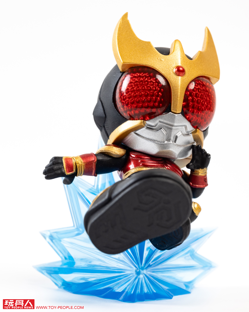 不像上次我們玩的超人力霸王,在底座利用了 PVC、ABS 為材料並製作出各式各樣的特效件,這次彷彿衝擊效果的藍色底座都是同樣的規格,讓施展騎士踢的一眾假面騎士們可以整齊地展示!仔細看還能發現在底部印製了石森プロ、テレビ朝日、東映......等字樣。