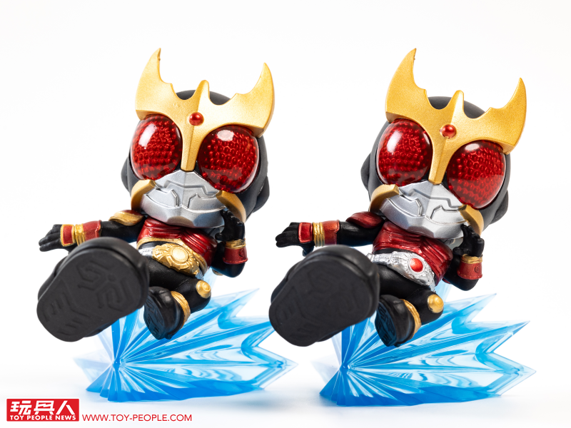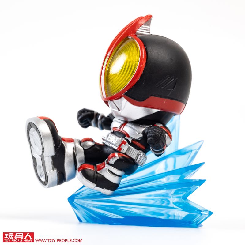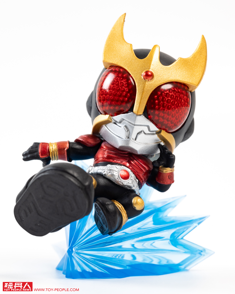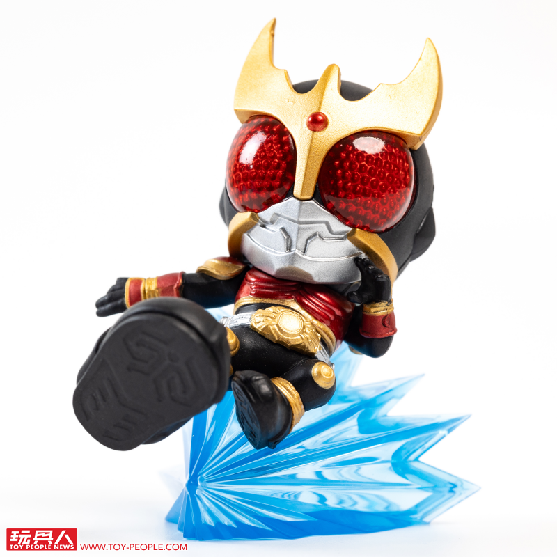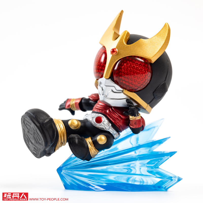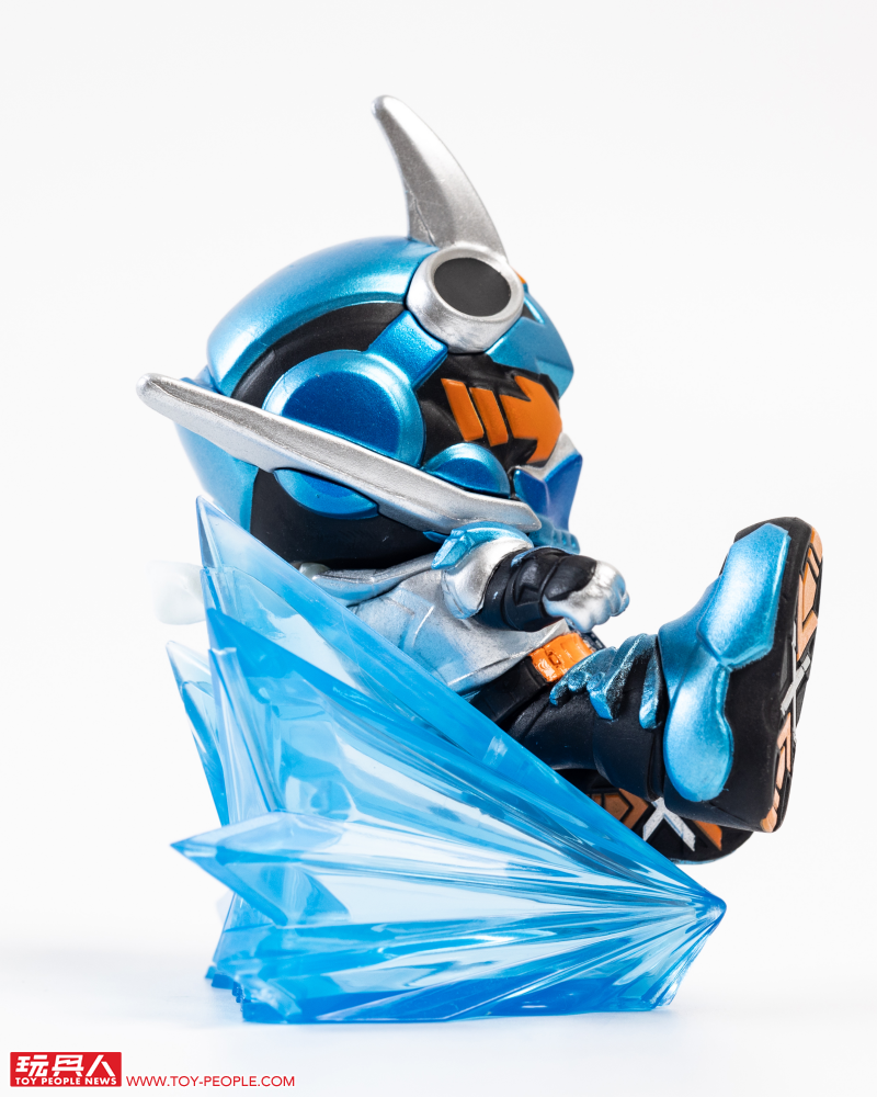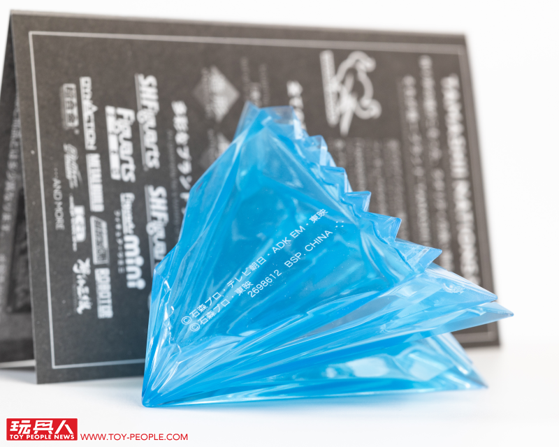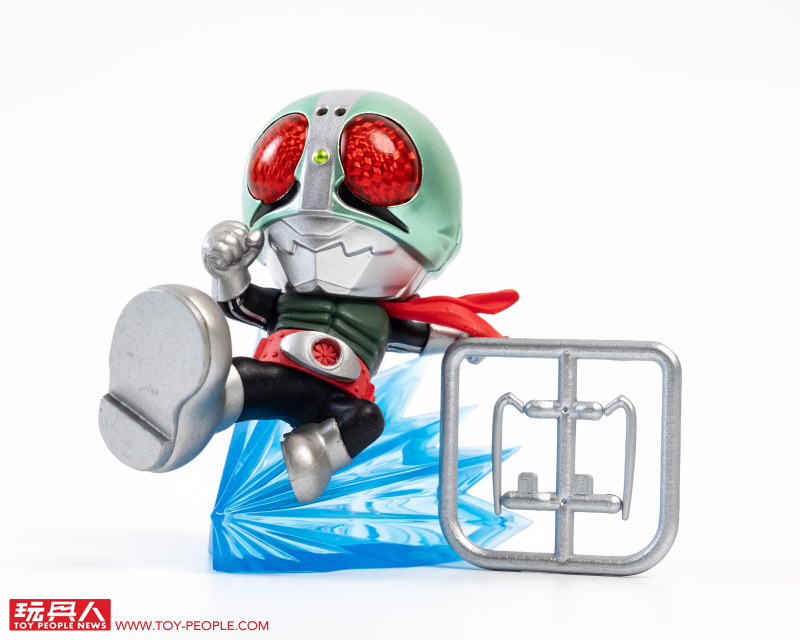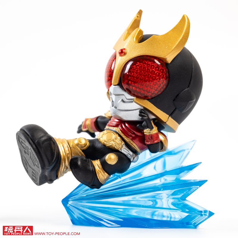 不像上次我們玩的超人力霸王,在底座利用了 PVC、ABS 為材料並製作出各式各樣的特效件,這次彷彿衝擊效果的藍色底座都是同樣的規格,讓施展騎士踢的一眾假面騎士們可以整齊地展示!仔細看還能發現在底部印製了石森プロ、テレビ朝日、東映......等字樣。