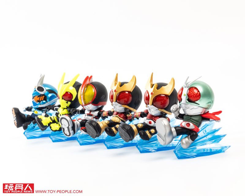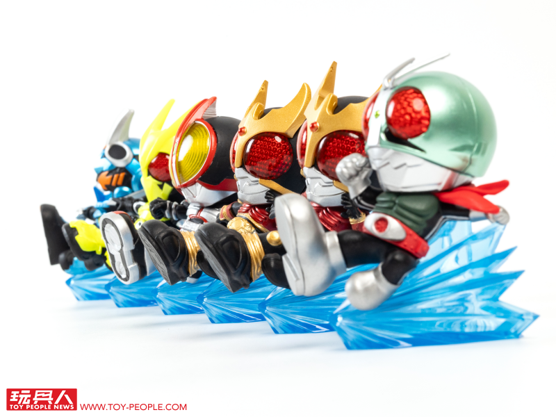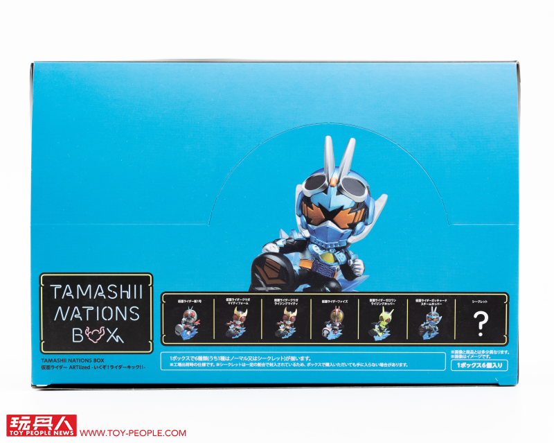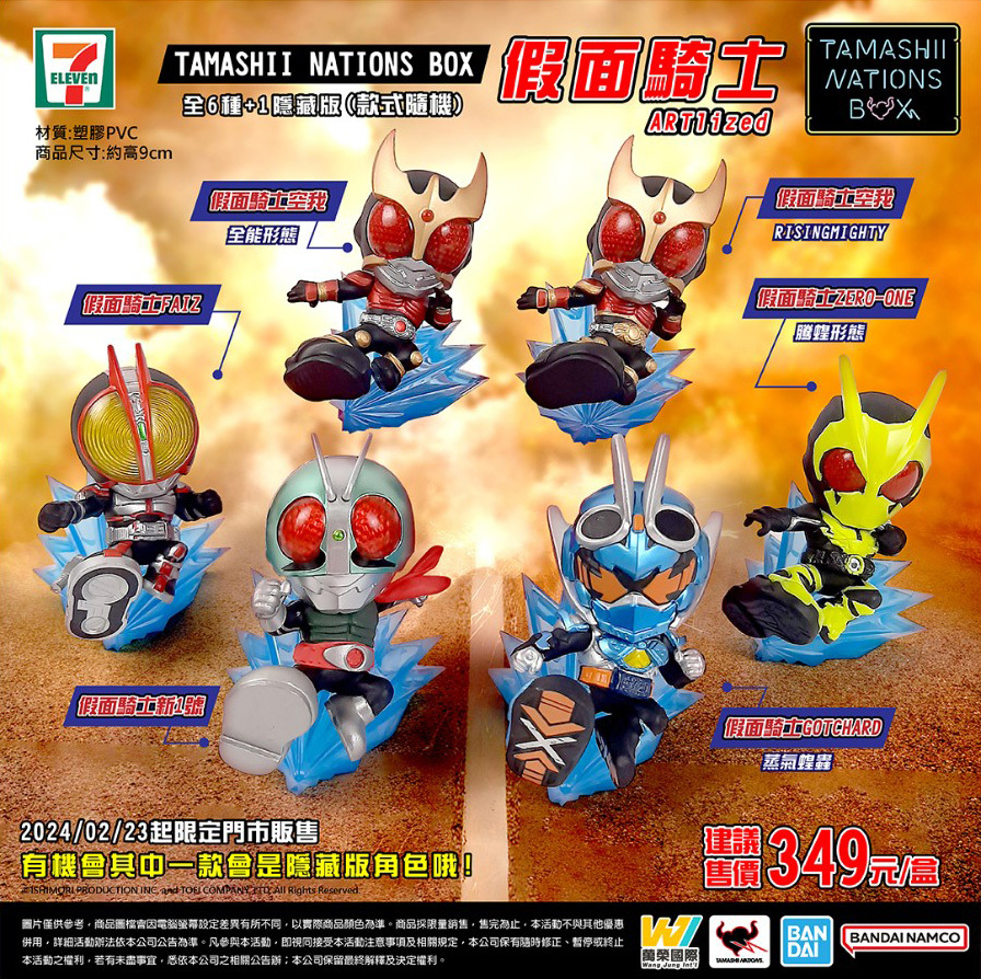 「TAMASHII NATIONS BOX 假面騎士 ARTlized 要上了!騎士踢!!」收錄了 6+1 隱藏(款式隨機)一共 7 款、橫跨各個世代的假面騎士,包含美好昭和、許多老派玩具人最愛的「假面騎士新1號」,平成時代的「假面騎士空我 全能形態」、「假面騎士空我 昇華全能形態」、「假面騎士FAIZ」,令和時代第一作的「假面騎士ZERO-ONE 躍昇蝗蟲形態」,以及 2023 年 09 月播映的系列最新作「假面騎士GOTCHARD 蒸汽蝗蟲形態」;那我們就趕快來看看這次一眾的可愛騎士吧!