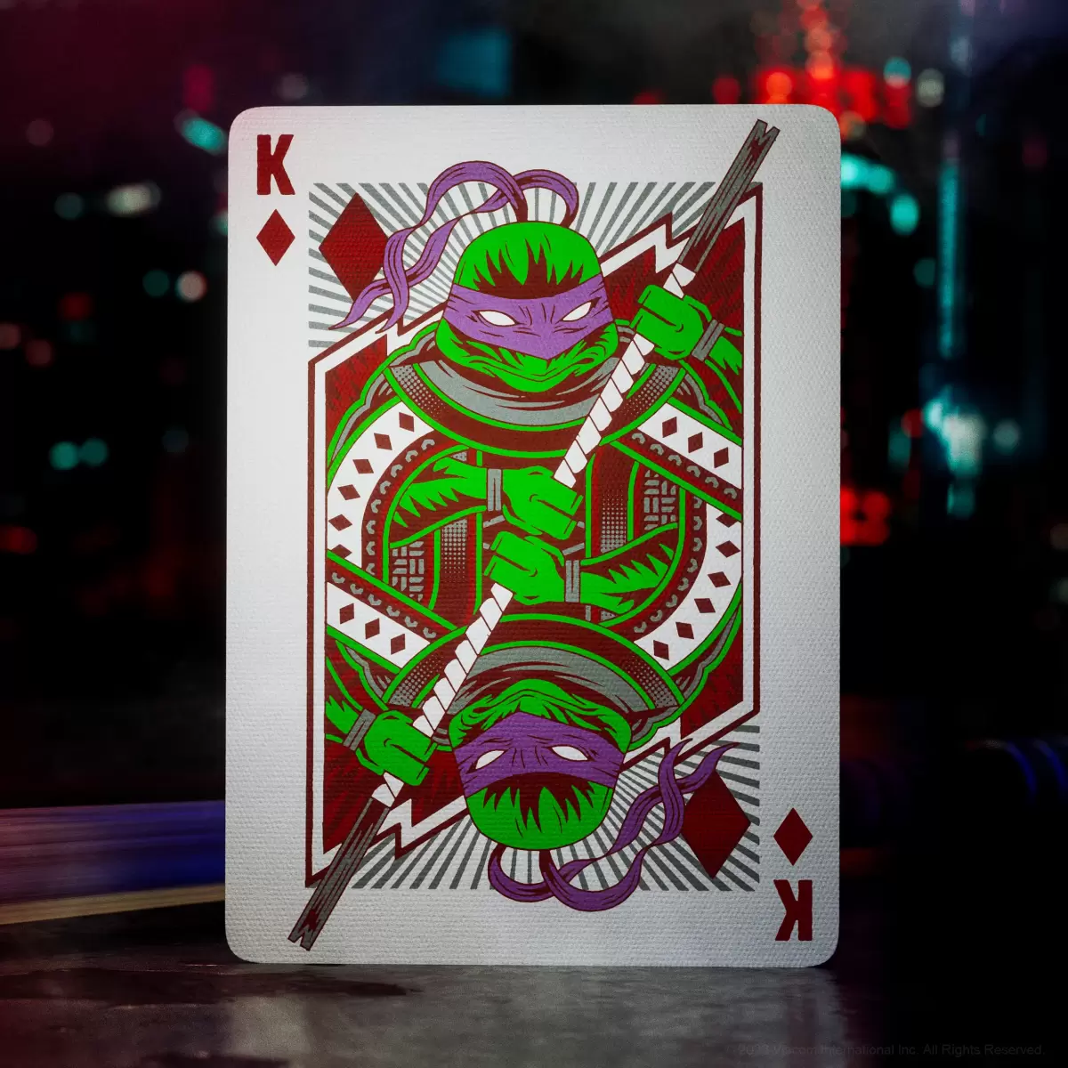 再來看到極具巧思的角色鋪克牌,由 theory11 發行的撲克牌皆是在美國生產、並採用 FSC 所認證的紙張來製造,本次也注入了銀箔增添高級感,而在經典角色的撲克牌風重新詮釋更是一大看點,包含神龜四兄弟的四花色 K、以披薩為主角的鬼牌、經典烏龜車載具 Party Wagon 樣式的方塊 A,以及許瑞德、克朗、史林特、艾波‧歐尼爾......這些角色。