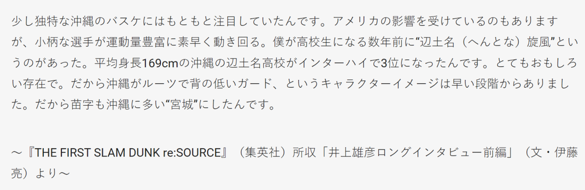 這讓我很快就將他想像成一個沖繩血統的矮個後衛。這是為什麼我選擇了在沖繩很常見的姓氏「宮城」在角色中,也電影版補足了這個設定,讓人想起這位球員。