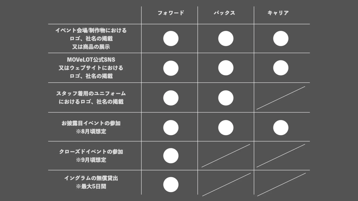 官方釋出的集資企劃分為三個等級,分別是三千萬日圓的「FORWARD フォワード 」、一千萬日圓的「BACKS バックス」,以及五百萬日圓的「CAREER キャリア」。