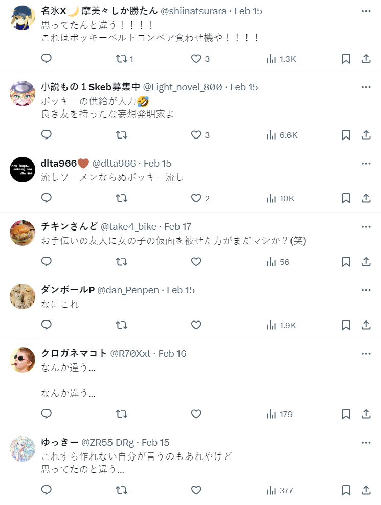 雖說很無厘頭,網友的迴響也十分踴躍,表示這台「跟美少女口對口傳 Pocky」的設備跟想像中不同啊,只是個需要他人手動餵食 Pocky 的機器阿 QQ。