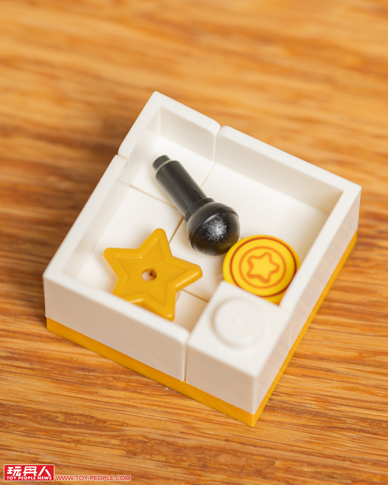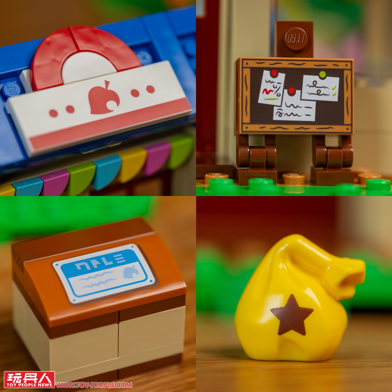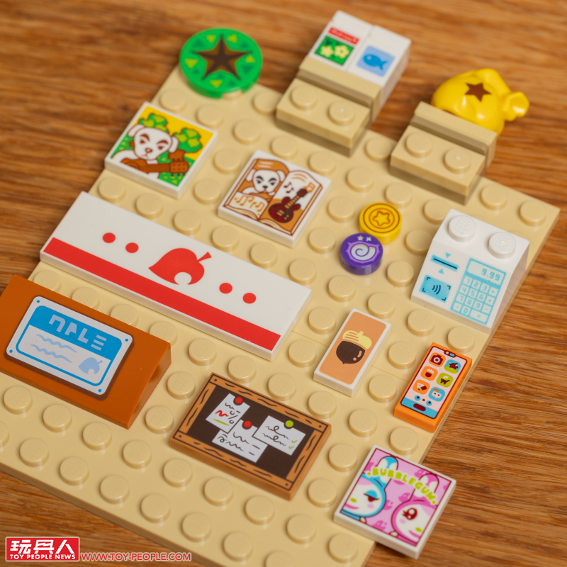 ▼ 在精美可愛的人偶之後,另一個讓人興奮的就是融入動森元素的印刷零件!小編這次把五款盒組裡頭的「動森主題印刷件」都先拿出來讓各位玩具人搶先看一下,從紅色葉子的 Nook 商店標誌、收購箱、鈴錢袋、鈴錢,到顯示出清單的手機都有,超級帶感!另外,這次的盒組沒有任何一張貼紙,所有的圖案都是印刷完成。