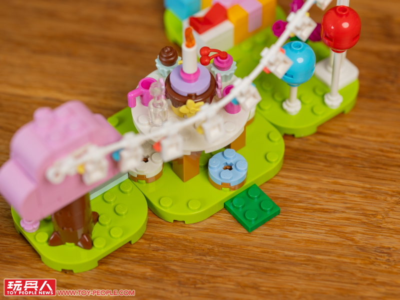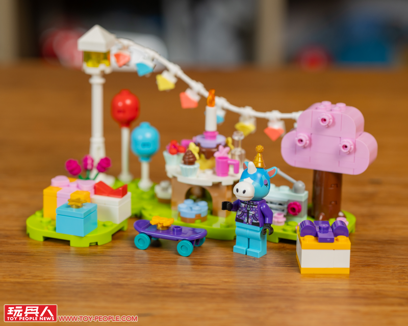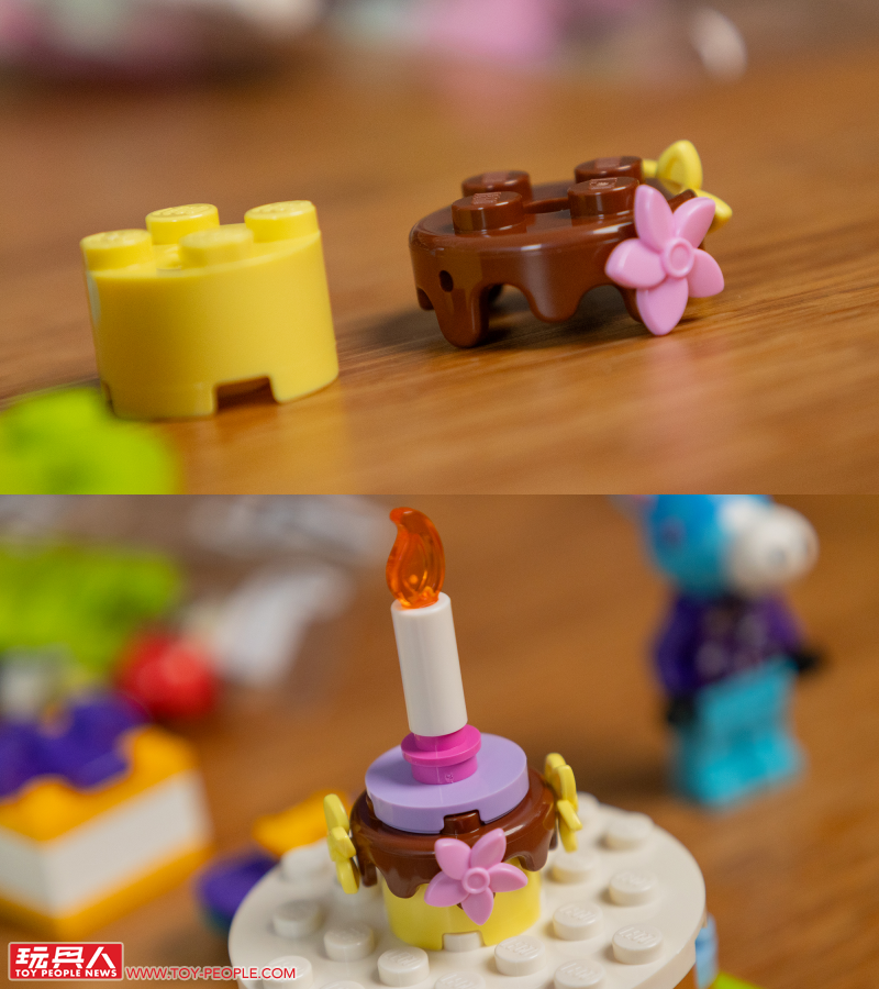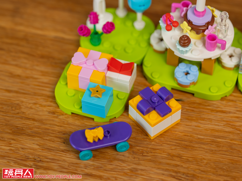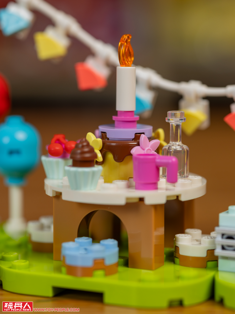 首先的 77046 用可愛禮物盒、擺滿蛋糕飲料的大圓桌,以及吊掛式繽紛裝飾帶出朱黎正在過生日的設定,其中有一個禮物還能打開,裡頭有著鈴錢、麥克風、星星。
