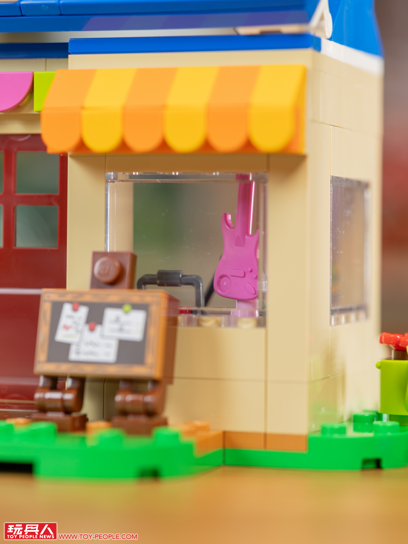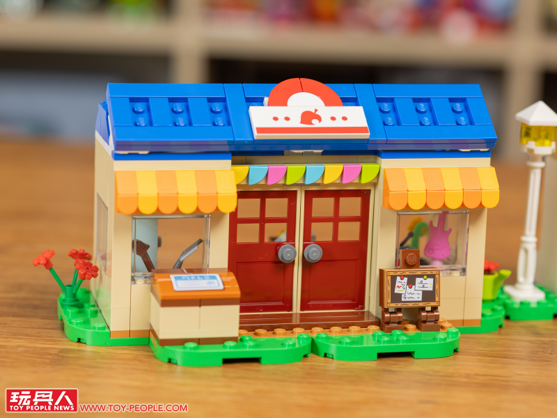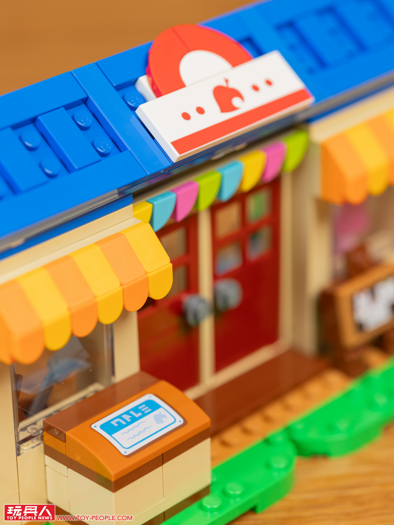 最後就是零件數突破 500 片、這次最大的一款盒組:Nook 商店與彭花的家!我們先從令人又愛又恨(?)的 Nook 商店開始,醒目的正藍色屋頂、橘黃色雨棚、佈告欄、收購箱,以及堪稱靈魂的紅色葉子招牌都做了出來。