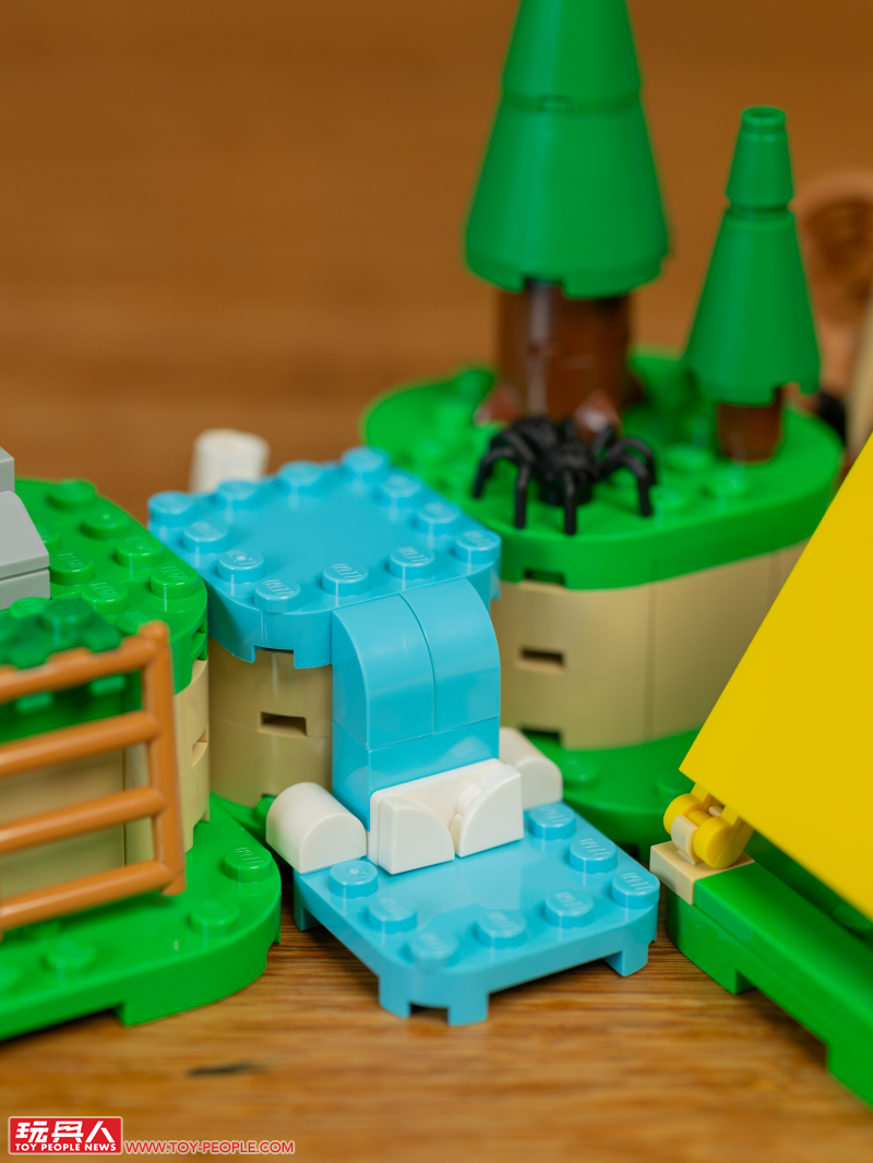 再來是本次零件數最少的一盒:莉莉安的歡樂露營,那頂簡單用上兩片黃色平面零件堆砌而成帳篷十分搶眼,而且本作在還原出遊戲中高地與瀑布流水地形的同時,還一併架好了梯子!