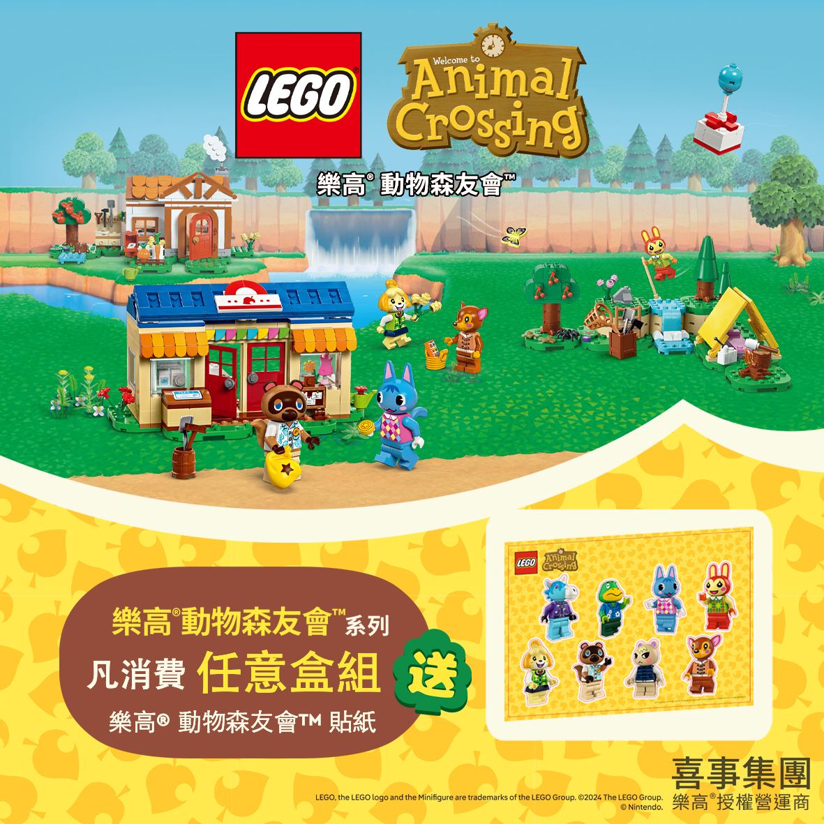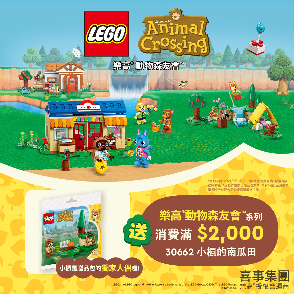 以上五款盒組預計 2024 年 3 月 1 日正式上市,只要在 3 月 1 日~21 日這段期間於樂高授權專賣店購買任一樂高動物森友會系列盒組即可獲得「樂高®動物森友會™」貼紙一張,系列消費滿 $2,000 即可獲得「LEGO 30662 小楓的南瓜田」