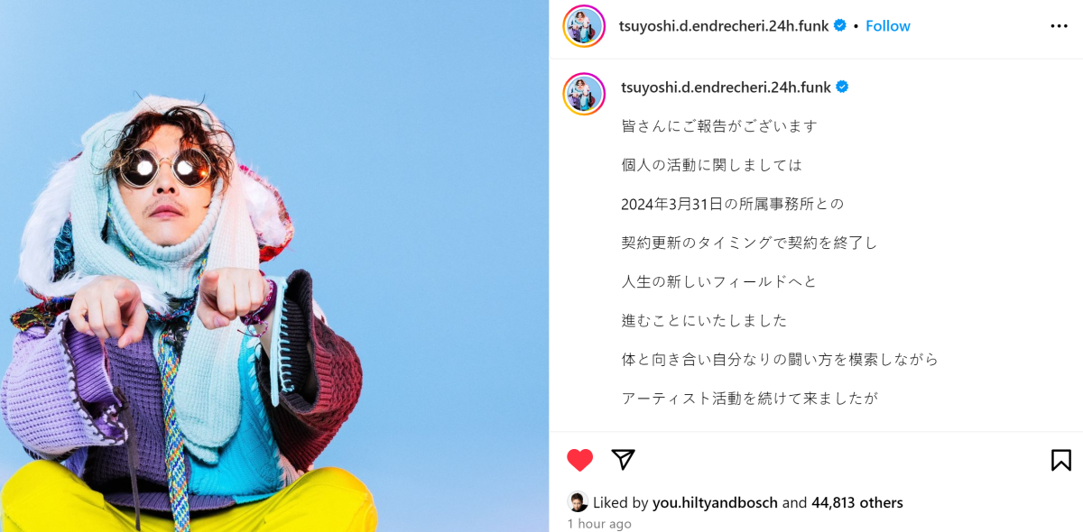 在今年 1 月剛傳結婚喜訊,SMILE-UP. 事務所 ( 過去的傑尼斯 ) 旗下藝人「近畿小子」成員之一的堂本剛,今日 ( 2/22 ) 在個人 instgram 上宣布,與事務所的合約已經到期,今年 3 月底正式結束後將正式退出,離開演藝生涯起步至今的經紀公司。未來也會持續自己的工作,邁向新的道路。